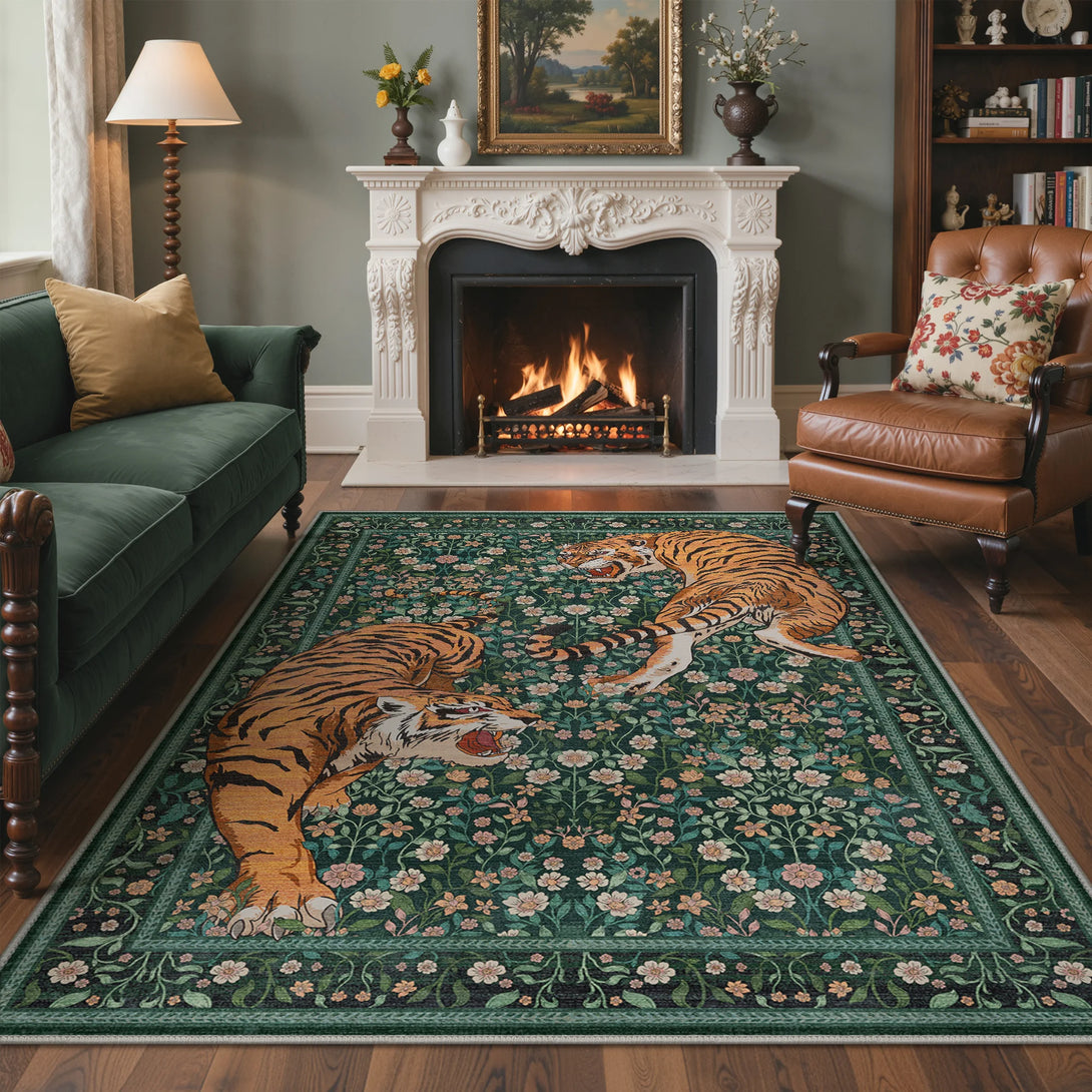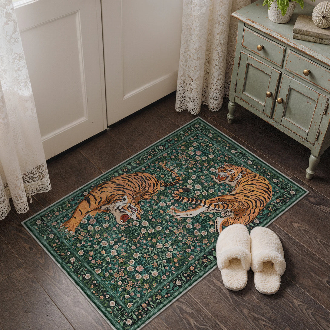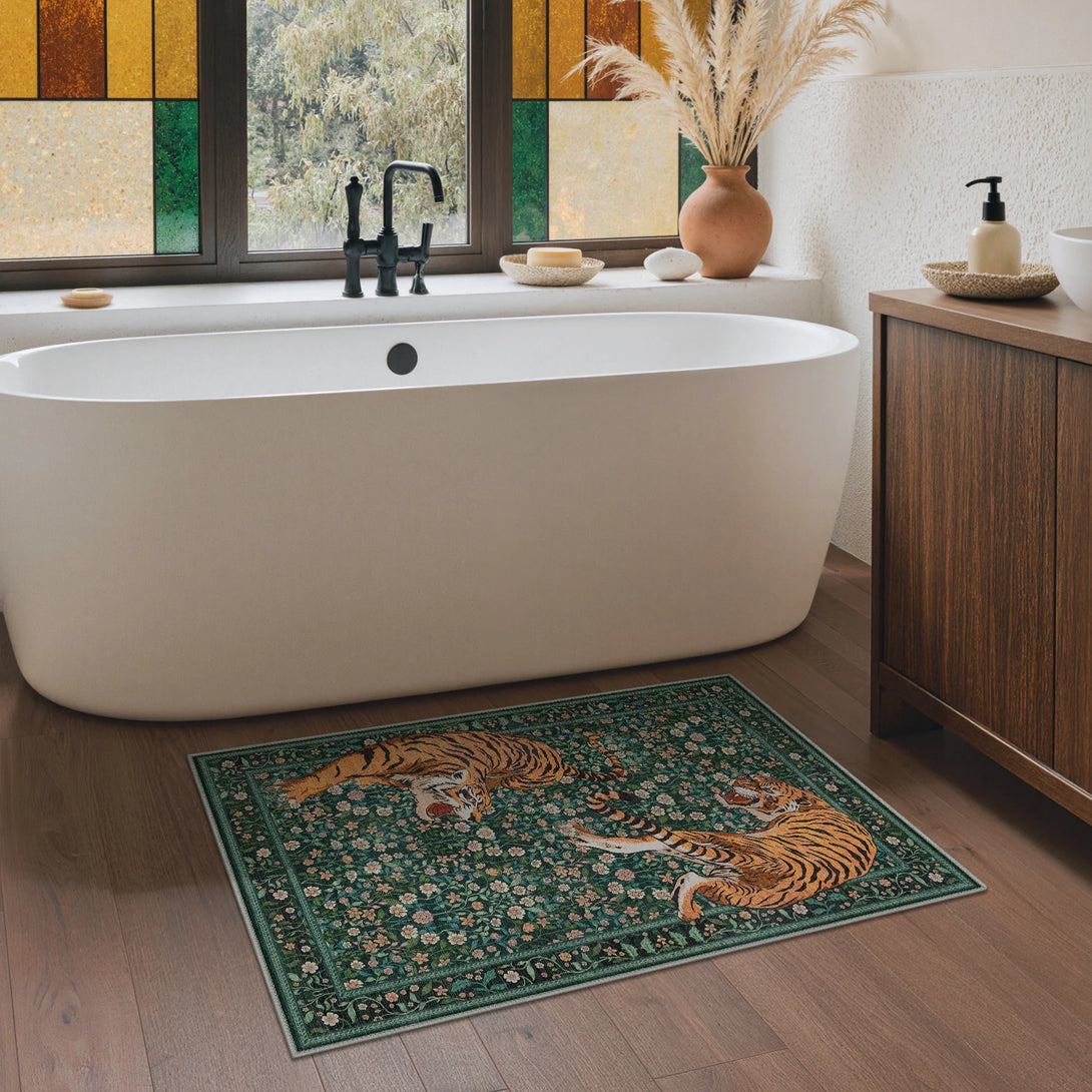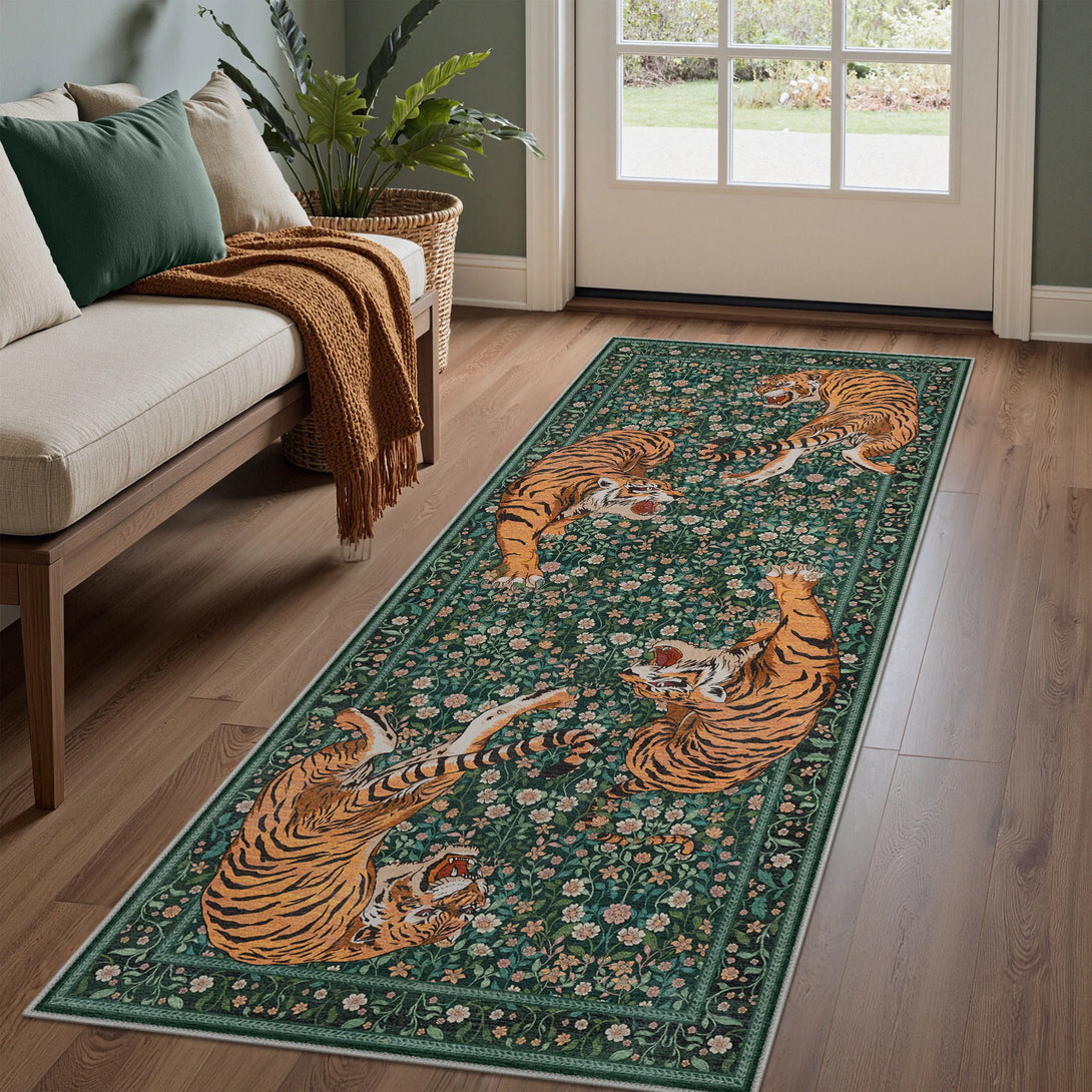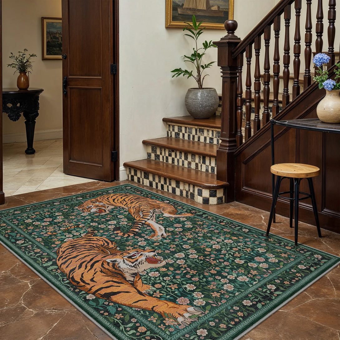 Bring untamed elegance into your space with this striking wild tiger rug. Featuring a sophisticated green palette and captivating tiger design, it transforms any room into a sanctuary of refined style. The plush, soft-touch surface invites barefoot comfort while maintaining its luxurious feel. Designed for practical living, this rug is fully washable, making it effortless to maintain its pristine appearance. Perfect for those who appreciate bold statement pieces without compromising on everyday functionality.