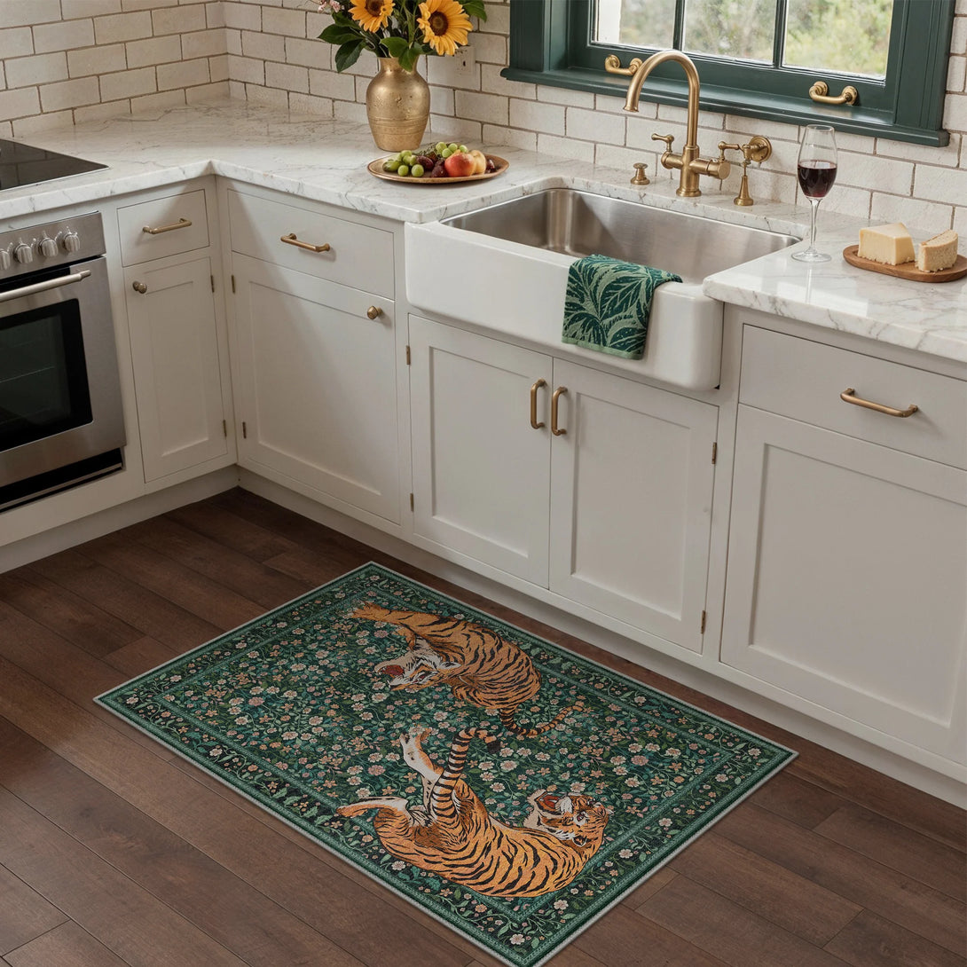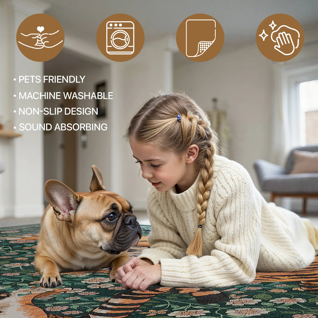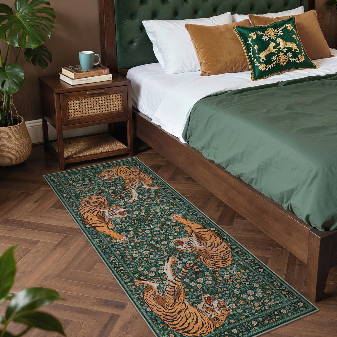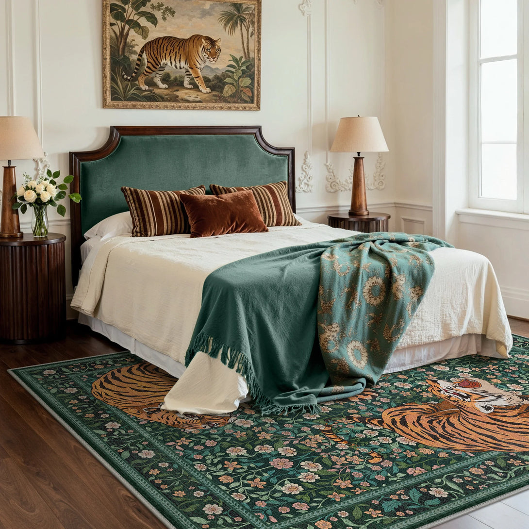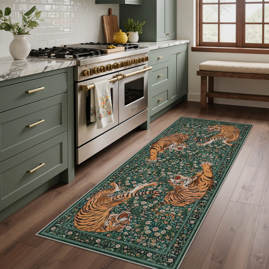 Bring untamed elegance into your space with this striking wild tiger rug. Featuring a sophisticated green palette and captivating tiger design, it transforms any room into a sanctuary of refined style. The plush, soft-touch surface invites barefoot comfort while maintaining its luxurious feel. Designed for practical living, this rug is fully washable, making it effortless to maintain its pristine appearance. Perfect for those who appreciate bold statement pieces without compromising on everyday functionality.