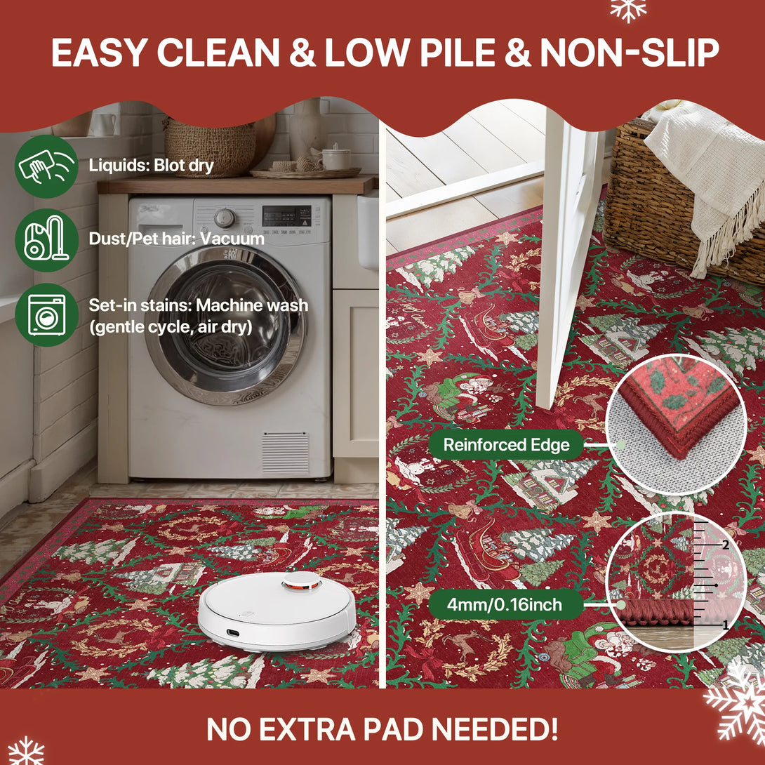Aurora Christmas Washable Santa Sleigh and Reindeer Belgian Velvet Rug – Machine Washable, Pet Friendly & Spill Resistant