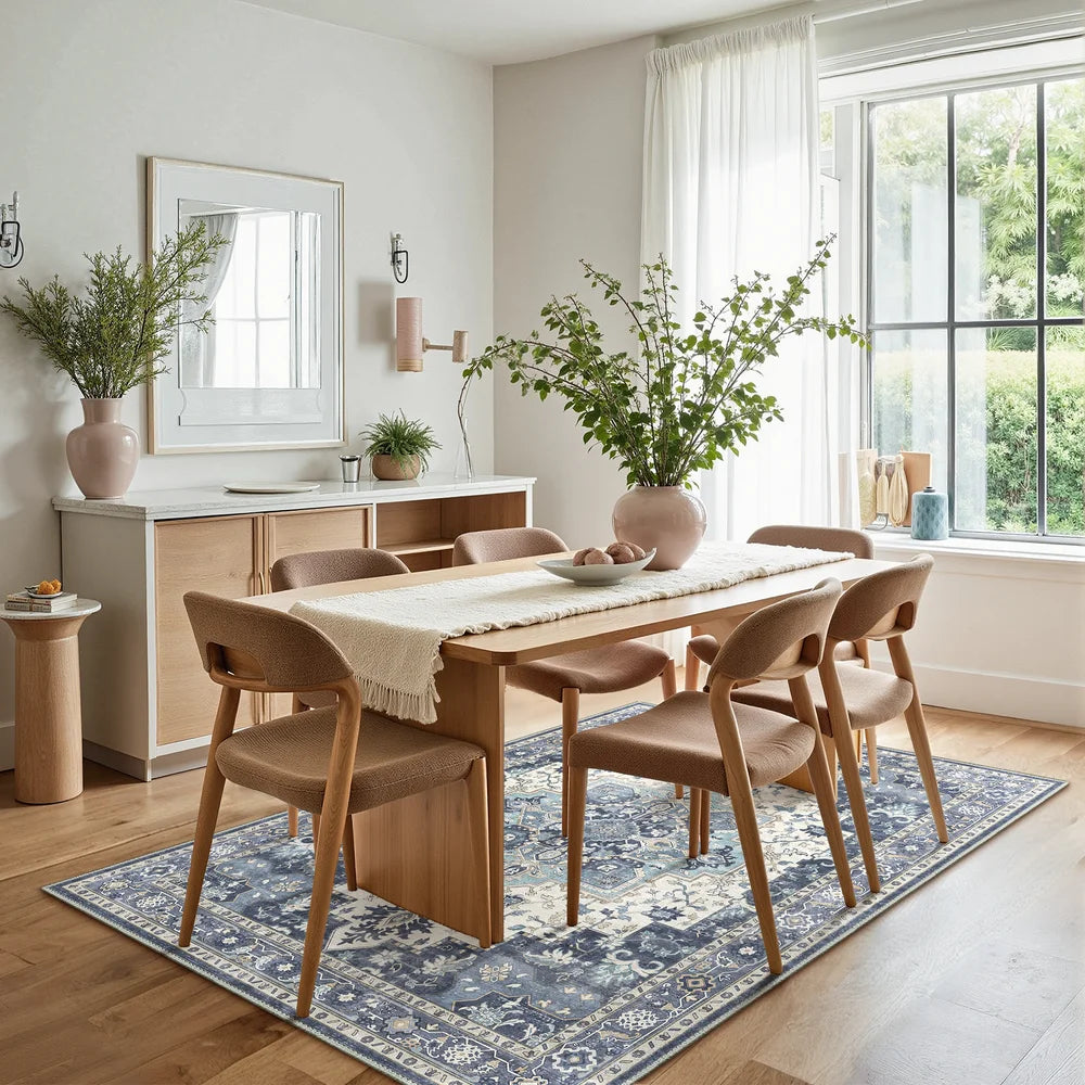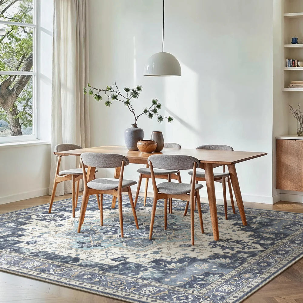 Built-in non-slip backing keeps the rug stable and safe, whether kids are running or pets are playing, even when chairs slide across it.