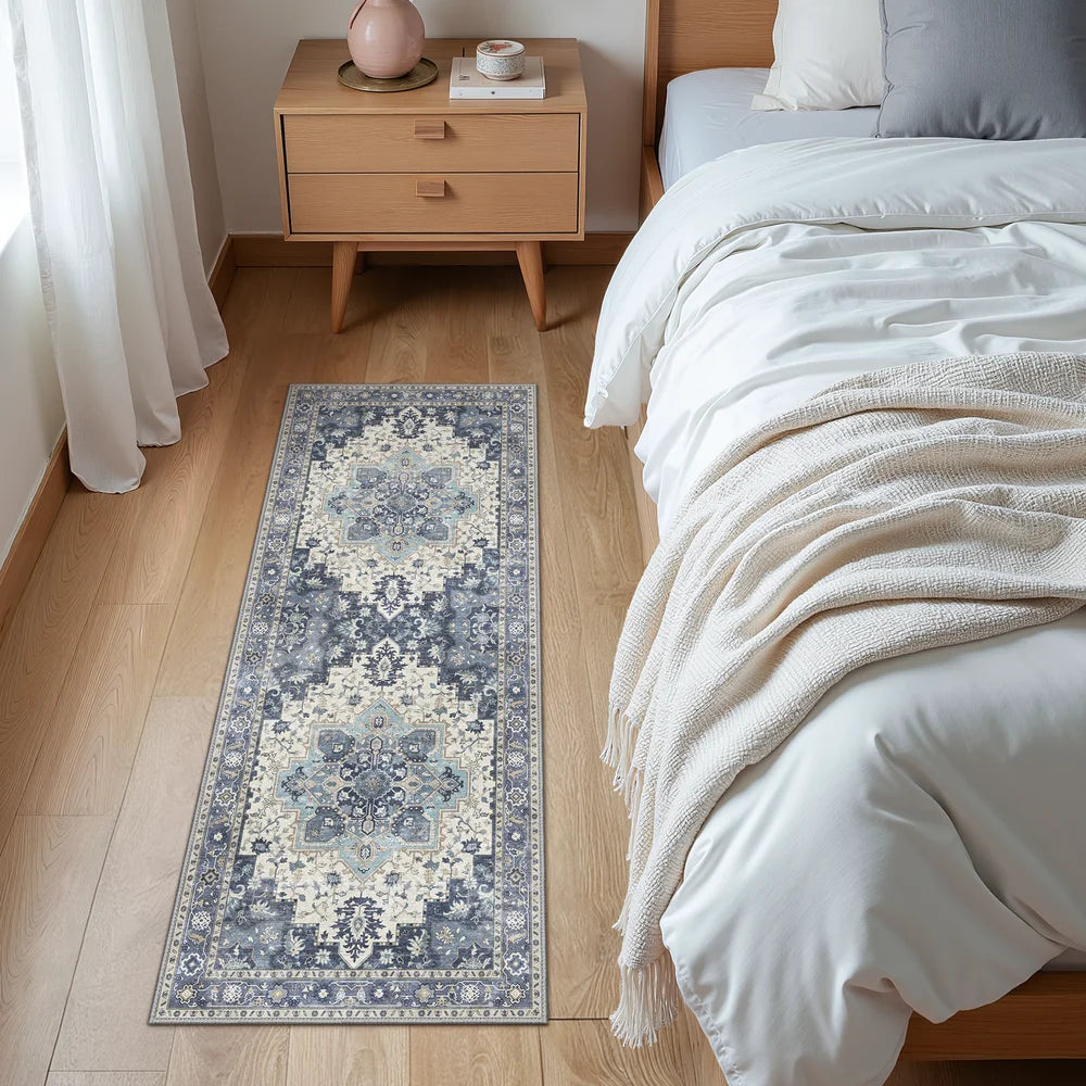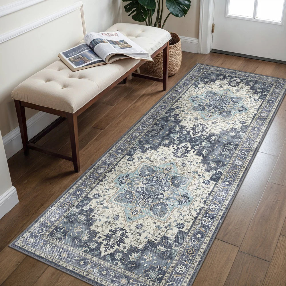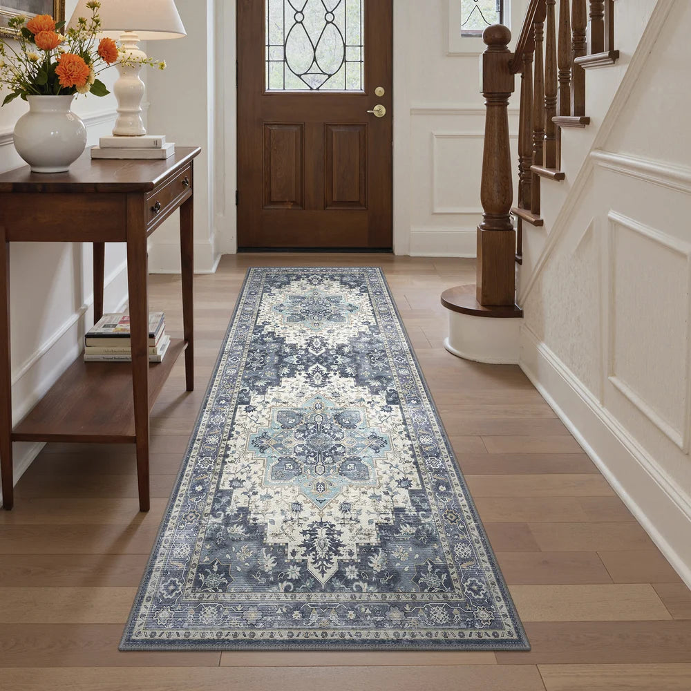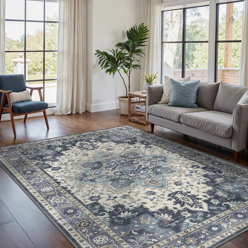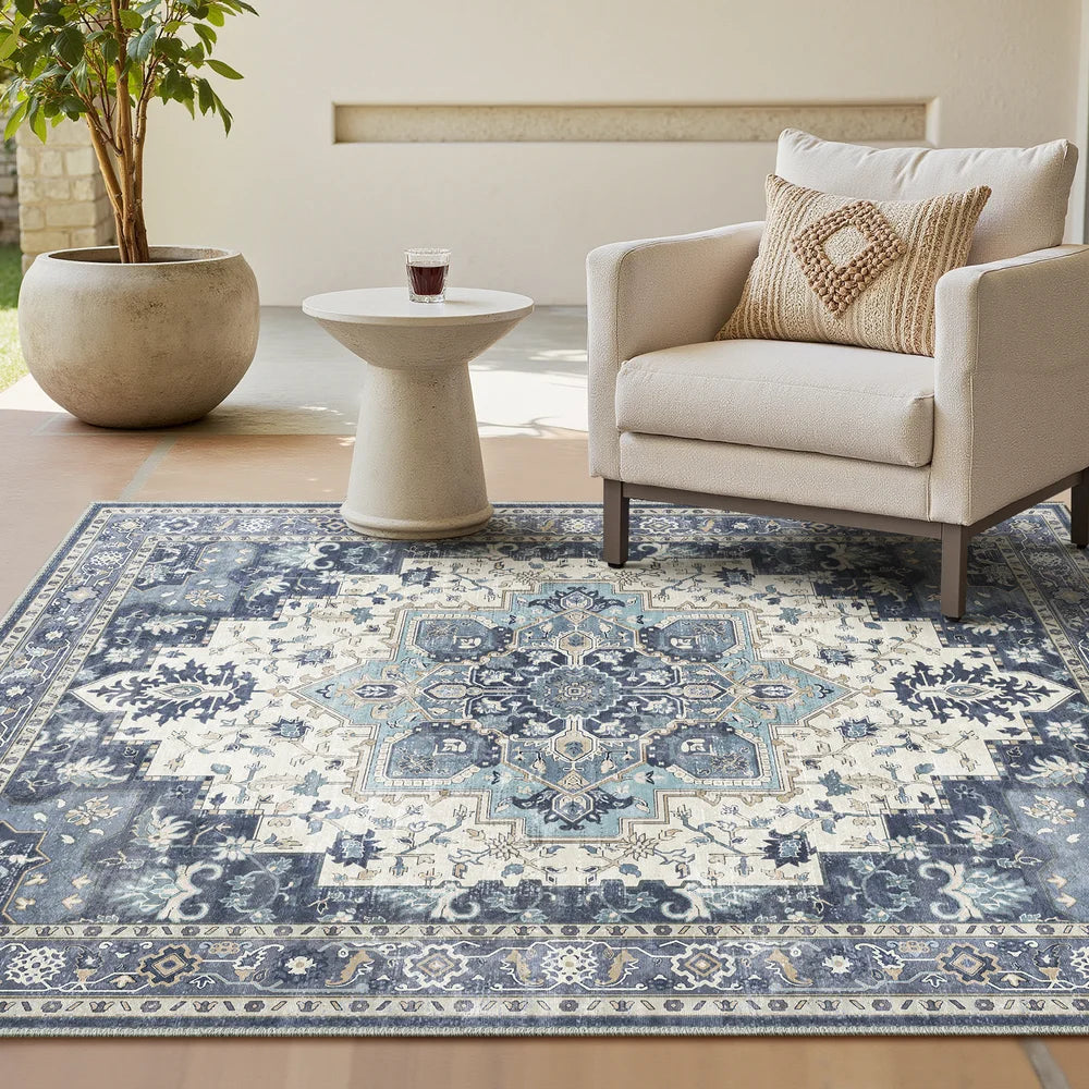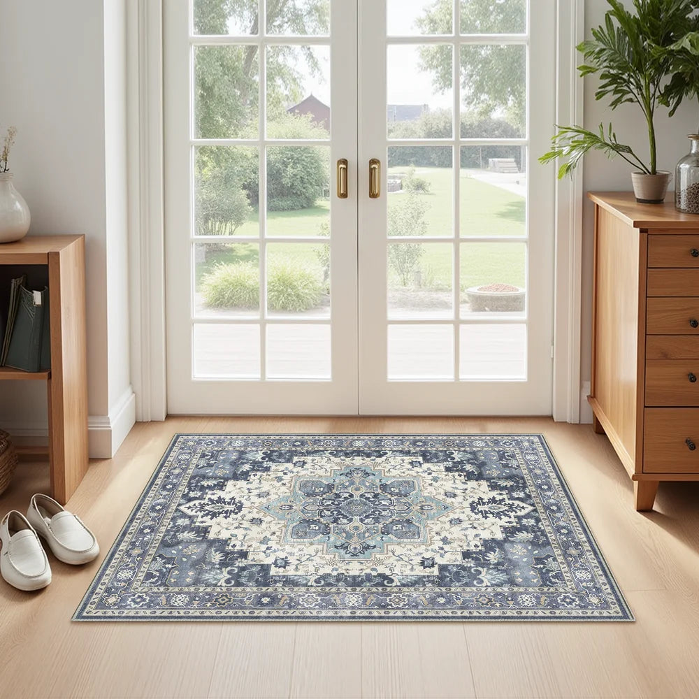 Introducing GENIMO Daria Washable Vintage Persian Tribal Rug—a sophisticated fusion of heritage craftsmanship and contemporary practicality. This exquisite piece showcases authentic Persian and Oriental design elements with classic tribal motifs rendered in elegant blue hues. Indulge in its luxuriously soft texture while enjoying the convenience of machine-washable care, ideal for households navigating daily life with grace. The secure non-slip foundation ensures stability on any floor, making it both a stunning focal point and a resilient choice for active families.