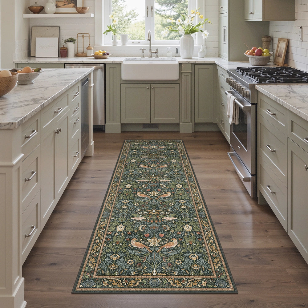 Inspired by classic garden murals, the Flavira Washable Vintage Floral Bird Rug blends delicate florals with graceful birds to bring a sense of calm, natural poetry into your home. Thoughtfully designed for everyday life, it keeps its beauty effortless with a fully washable construction. Soft green tones and intricate botanical details create a serene sanctuary that's as practical as it is lovely—nature's tranquility, ready to live with.