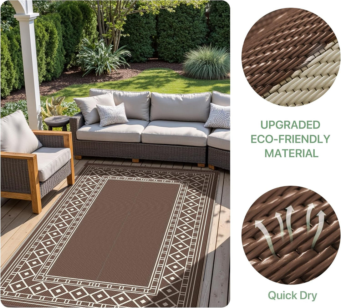 - Geometric Elegance Reimagined: Elevate your outdoor spaces with GENIMO's remarkable geometric outdoor rug! Merging the allure of modern art with the practicality of an all-weather accessory. Its striking diamond frame encases a sleek rectangular center, exuding a timeless charm that captivates onlookers. From patio to garden beach deck backyard porch garage rv camping, etc. What's more, you can even bring the beauty of nature indoors