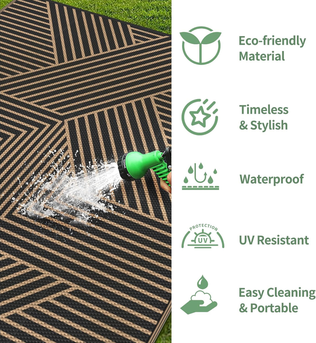 - Durable & Waterproof: Crafted from 100% upgraded plastic material, this outdoor rug is built to last. Waterproof outdoor carpet material allow liquids to penetrate and dry quickly. The double-sided weaving process enhances durability, while the heat-treated edges prevent fraying. Enjoy a product that is tough enough for outdoor adventures yet soft to the touch for ultimate comfort