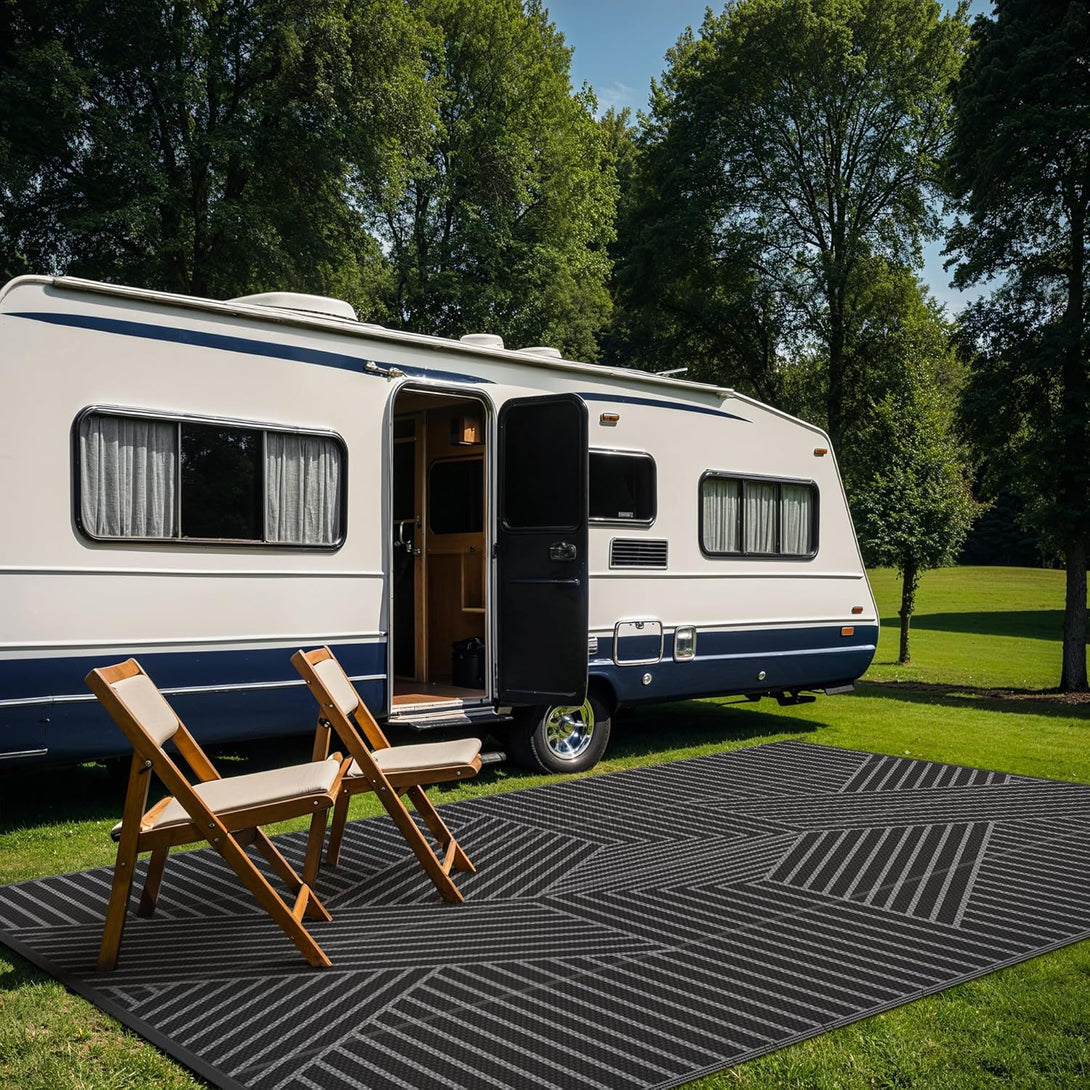 - Versatile & Portable: Available in multiple sizes (e.g., 5'x8', 6'x9', 8'x10', 9'x12'), GENIMO's outdoor rug is perfect for a variety of outdoor activities, including RV trips, camping, picnics, beach days, and tailgating. Lightweight and foldable, it comes with a carry bag for easy transport. Plus, the four corner loops and stakes help secure the rug in place, ensuring it stays put during your adventures