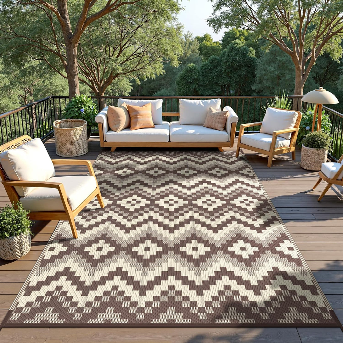 - Extend Use Time: The reversible design of GENIMO outdoor rug can withstand the natural wear and tear of the outside world.You can flip the rug around to double its lifespan, seamlessly complementing your patio furniture set through seasonal changes. Two classic geometric patterns can be swapped to refresh the look of your patio decor. The dark color hide dirt better and keeps your outdoor mat looking new for a long time. Add deep elegance to your outdoor/indoor decor