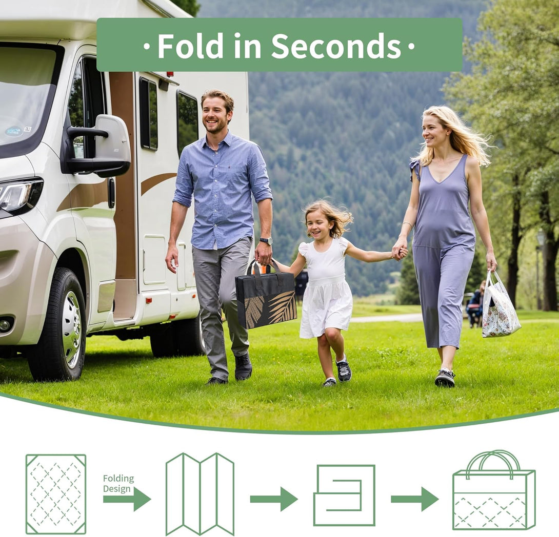 - Perfect Choice For RV Camping: Woven from lightweight plastic straws, these RV outdoor rugs can be easily folded down to a compact size to fit in our included carry bag. This portable waterproof outdoor rug allows you to take it outside easily, and also designed 4 corner loops with 4 stakes to help fix the carpet in place. Using this camper rug will relieve all the burden and fatigue of your RV trips and camping, allowing you to have plenty of imaginable space for more fun