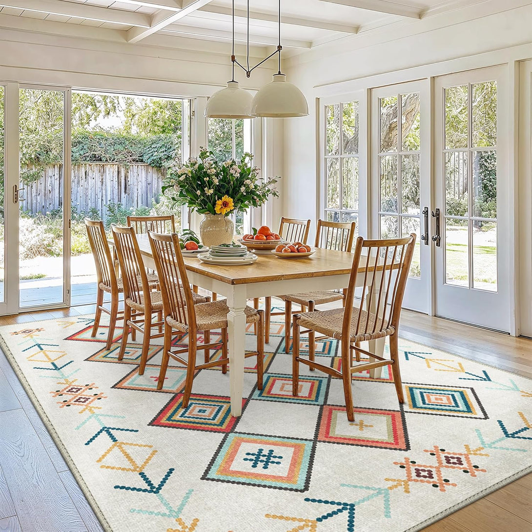 Built-in non-slip backing keeps the rug stable and safe, whether kids are running or pets are playing, even when chairs slide across it.