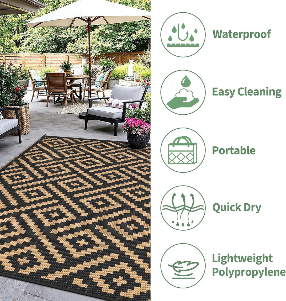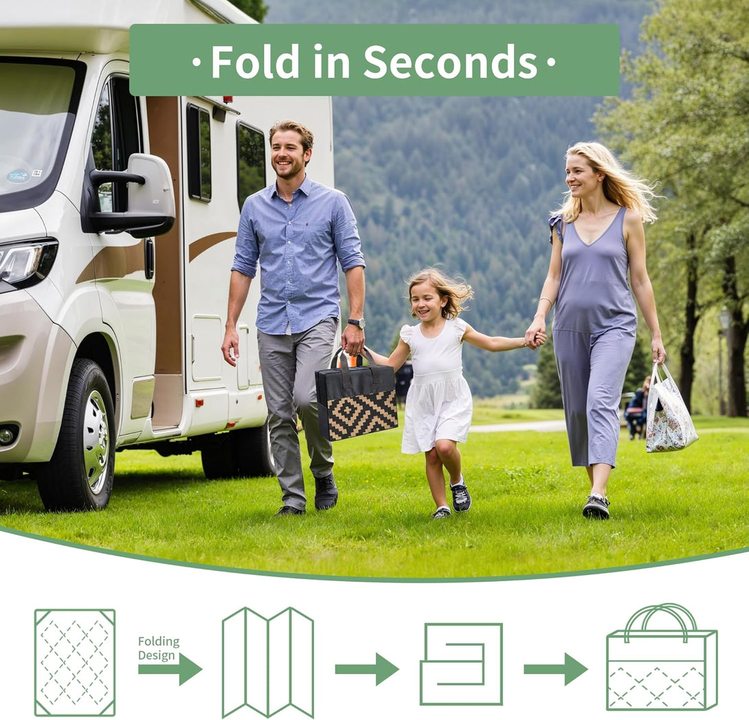 - 【EASY CLEANING & PORTABLE】Outdoor rug waterproof fabric can resist all kinds of drinks and food stains, also no need to worry about outside sand and dirt, just wipe and shake with a cleaning cloth. For a deep clean, you can use a damp cloth dampened with mild soap, rinse with water, and allow to air-dry within a few minutes. Outdoor plastic straw rug added seams can be rolled or folded to a compact size, and comes with a carry bag for easy transport.