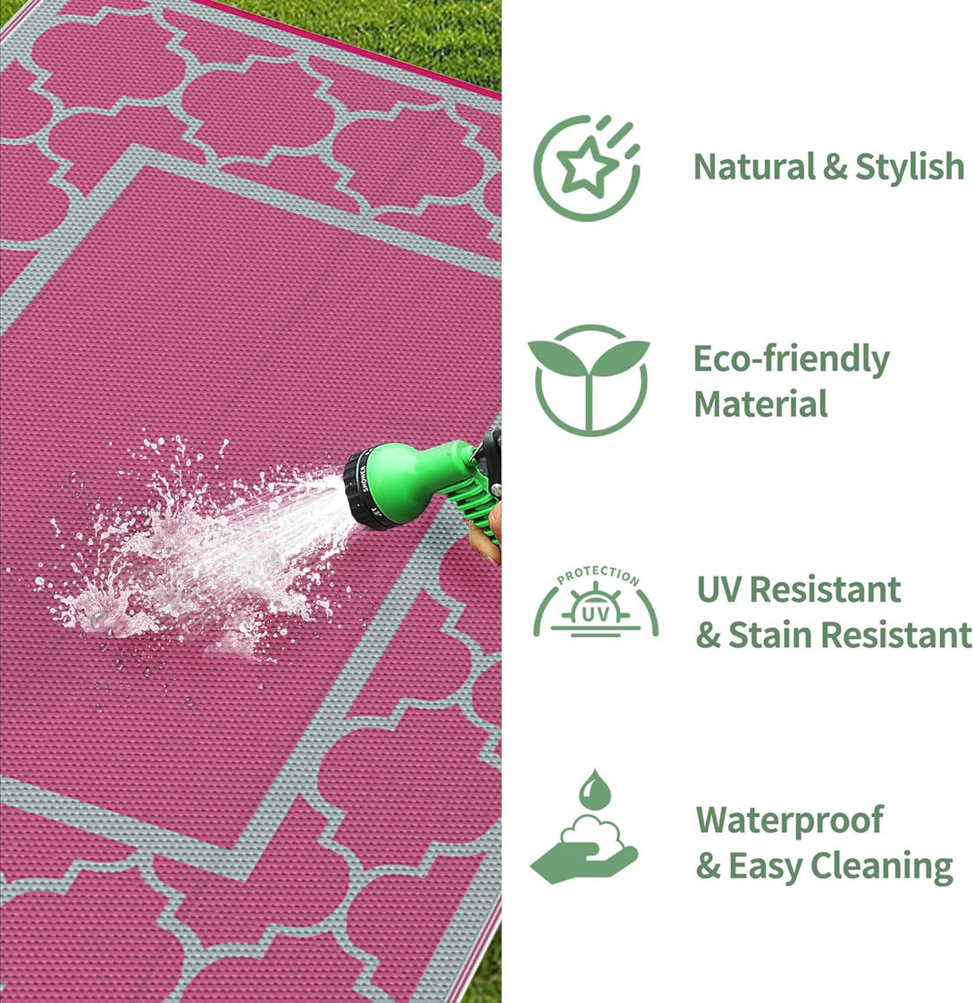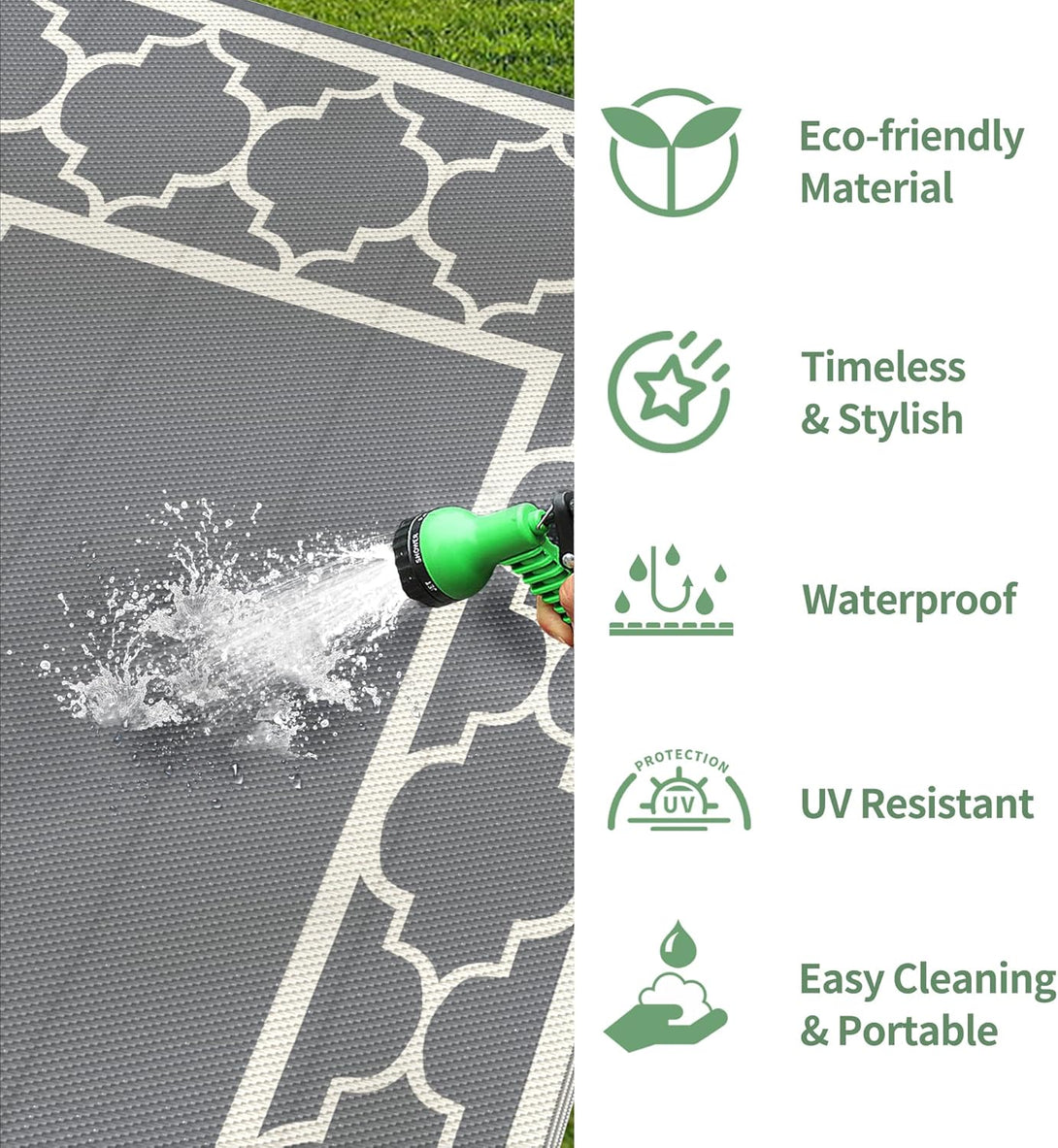- Upgraded Materials & Reversible Use: GENIMO's outdoor plastic straw rug, crafted from recyclable polypropylene, features eye-catching patterns and is fully reversible. Waterproof and durable, it's an ideal choice for camping, patios, and outdoor relaxation, thanks to the upgraded weaving process. Whether used on one side or the other, it seamlessly integrates with the outdoor environment, bringing joyful moments