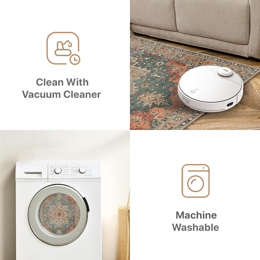 - Machine Washable: Our boho area rug is designed for convenience and fits seamlessly into any lifestyle. Machine wash with cold water on gentle cycle (not to add bleach), air dry or dry on air-only cycle without heat. For daily upkeep, use a vacuum cleaner or a quick wipe. Its VERY THIN design allows for easy removal of pet hair and other debris.