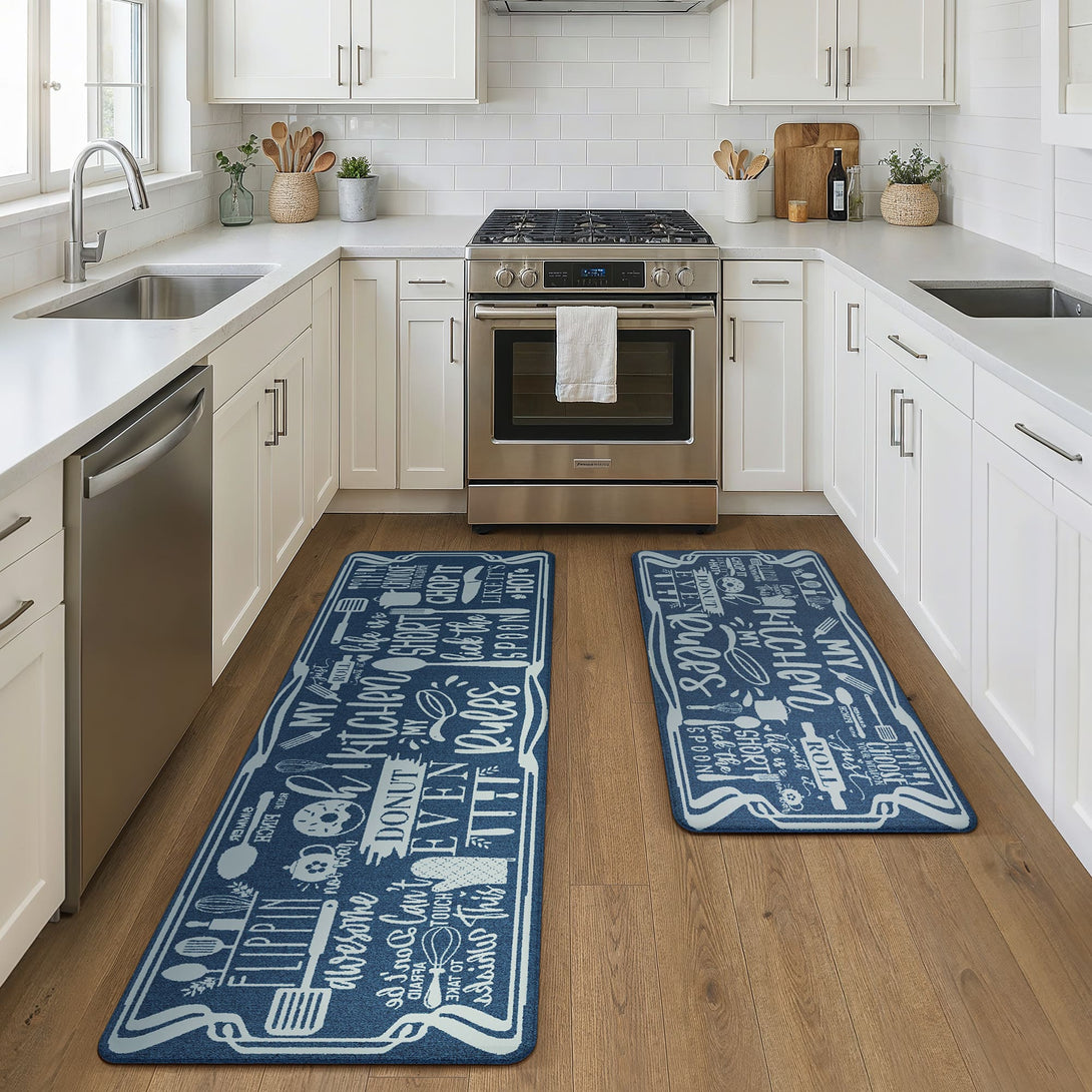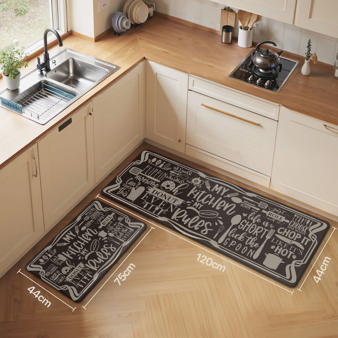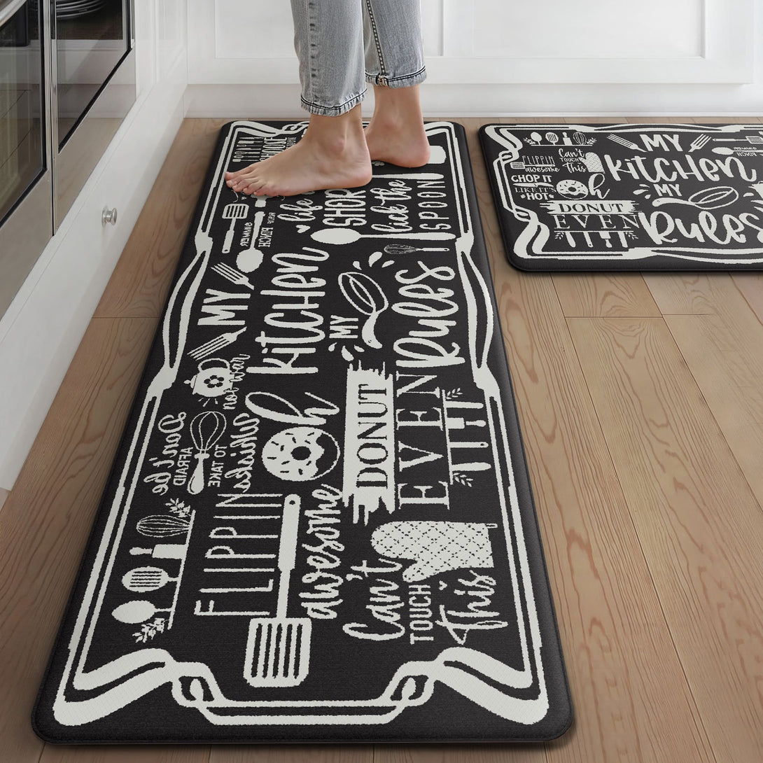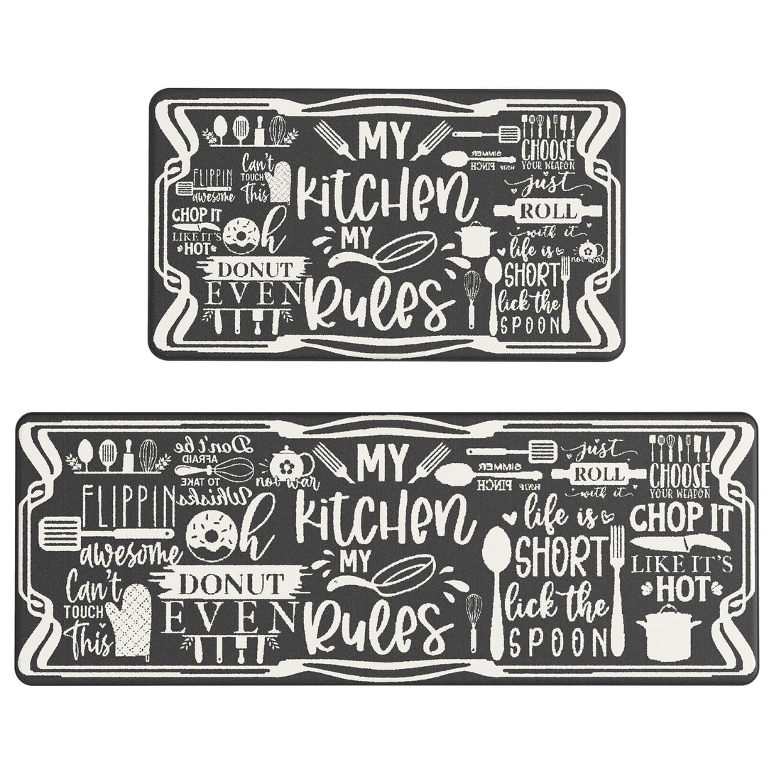 - Kitchen Rules Designed: Elevate your kitchen and home decor with this eye-catching functional mat. Features classic "Kitchen Rules" lettering and utensil patterns (pots, pans, spatulas) for thematic charm. Combines personality with utility – essential kitchen decor and accessories that upgrade any cooking space