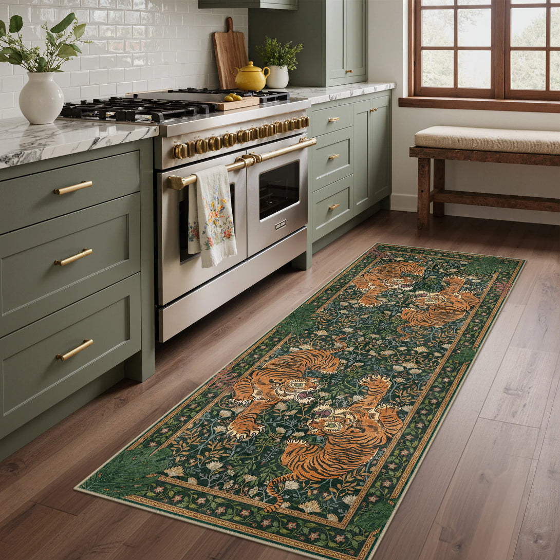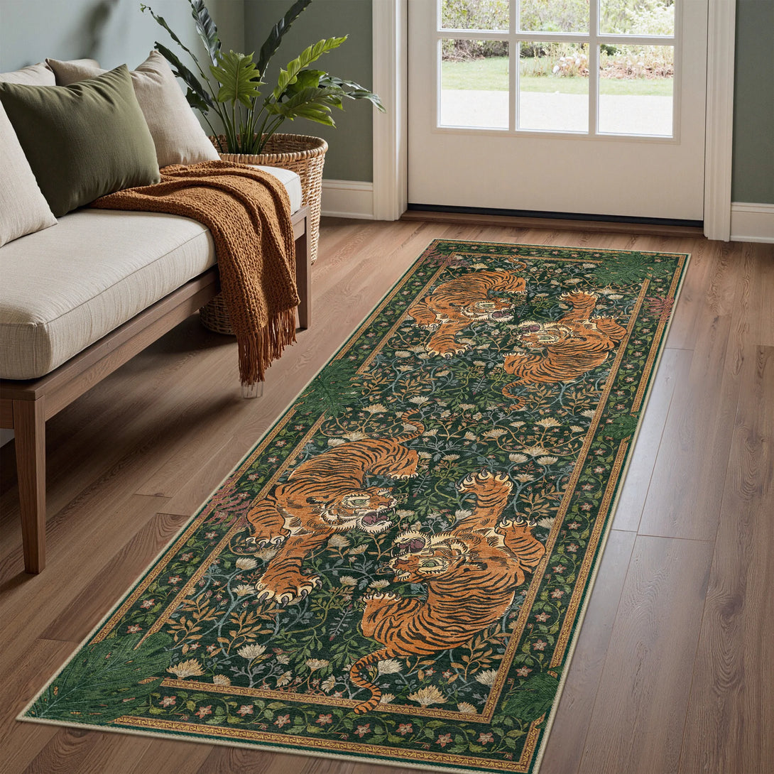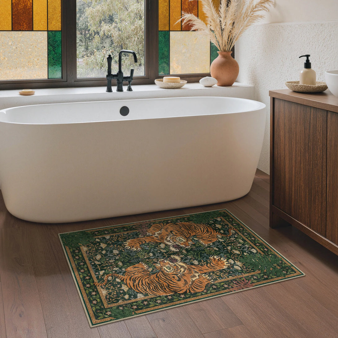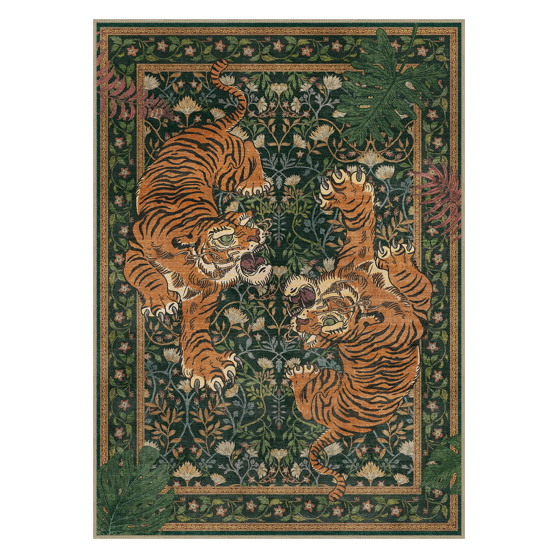 Bring untamed elegance into your space with this striking wild tiger rug. Featuring a sophisticated green palette and captivating tiger design, it transforms any room into a sanctuary of refined style. The plush, soft-touch surface invites barefoot comfort while maintaining its luxurious feel. Designed for practical living, this rug is fully washable, making it effortless to maintain its pristine appearance. Perfect for those who appreciate bold statement pieces without compromising on everyday functionality.