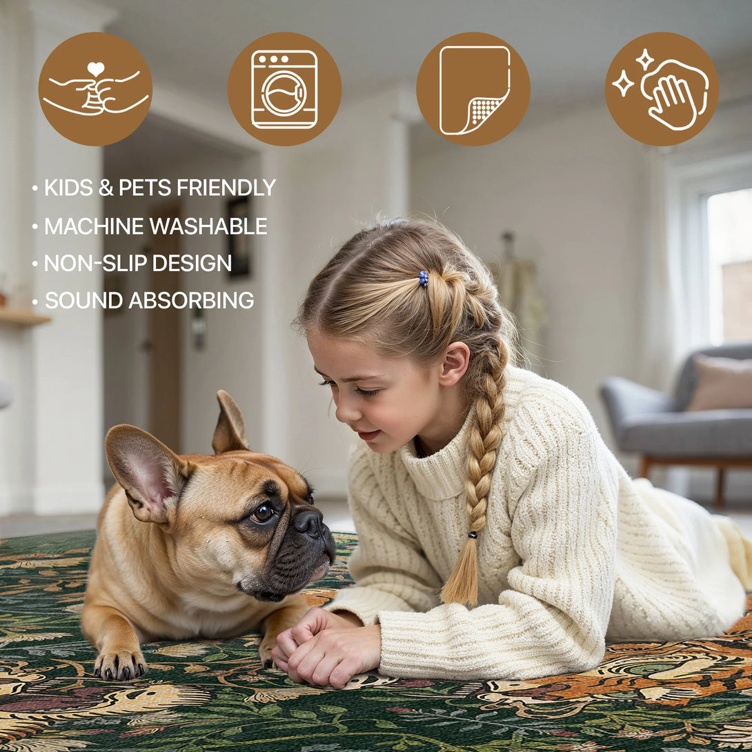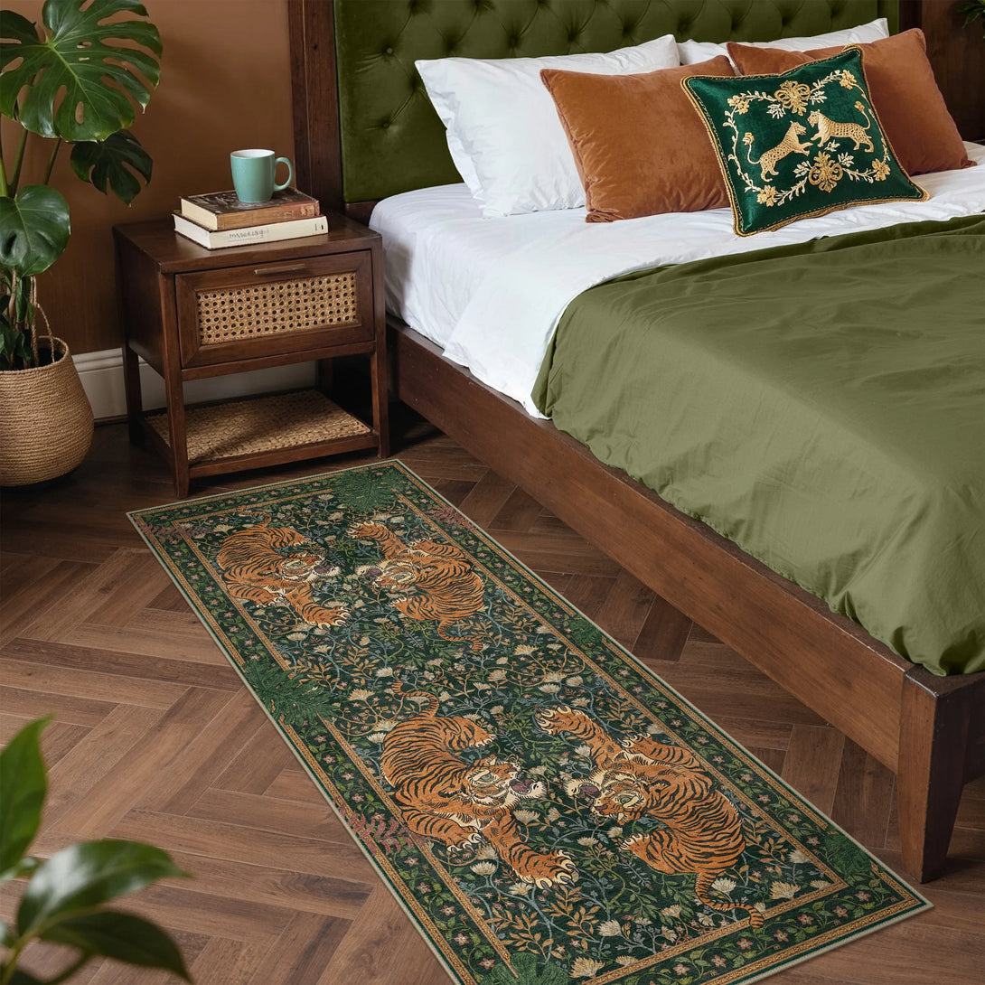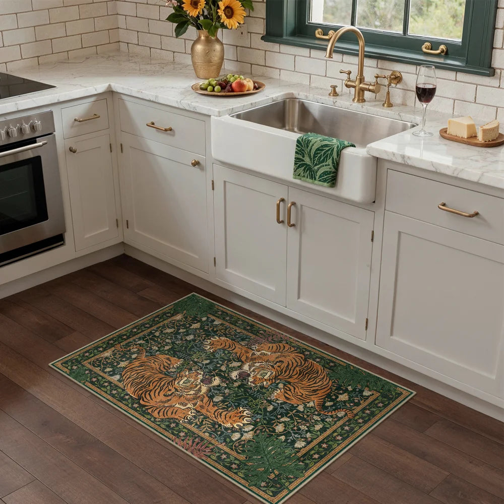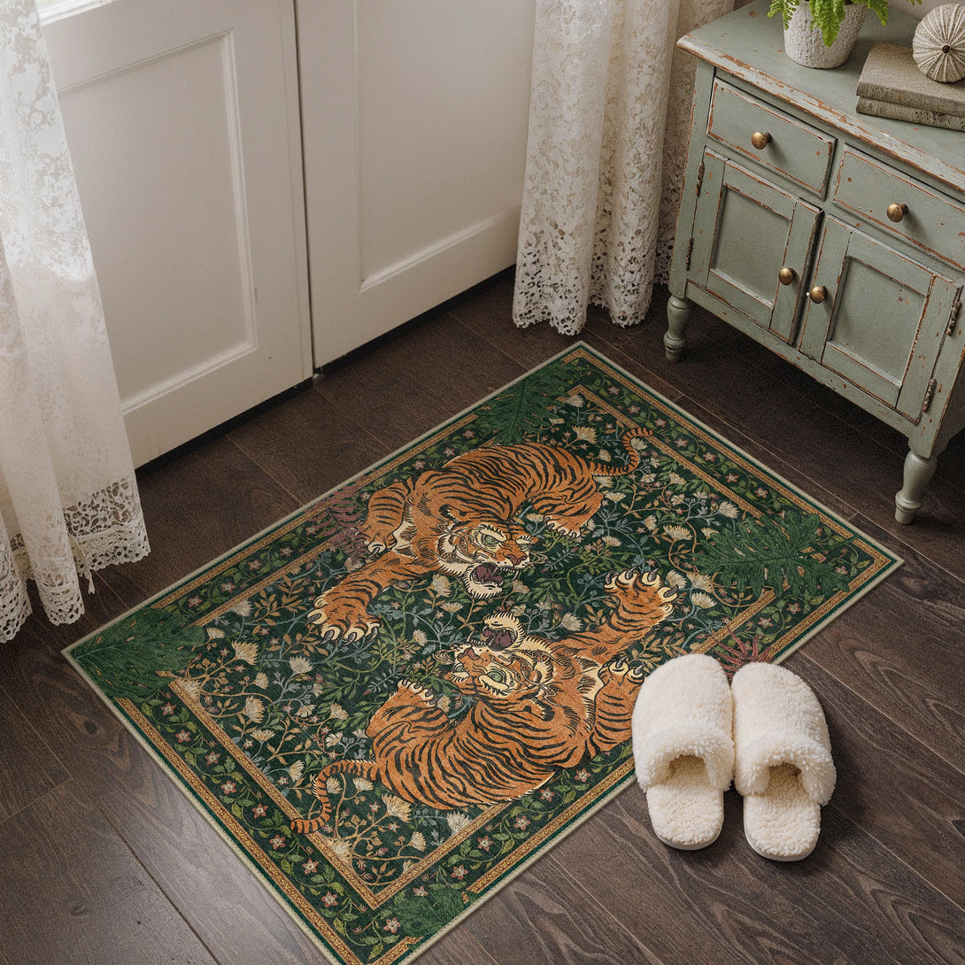 Bring untamed elegance into your space with this striking wild tiger rug. Featuring a sophisticated green palette and captivating tiger design, it transforms any room into a sanctuary of refined style. The plush, soft-touch surface invites barefoot comfort while maintaining its luxurious feel. Designed for practical living, this rug is fully washable, making it effortless to maintain its pristine appearance. Perfect for those who appreciate bold statement pieces without compromising on everyday functionality.