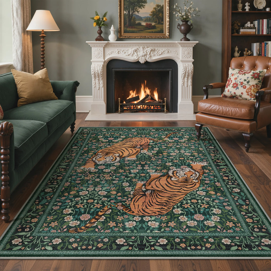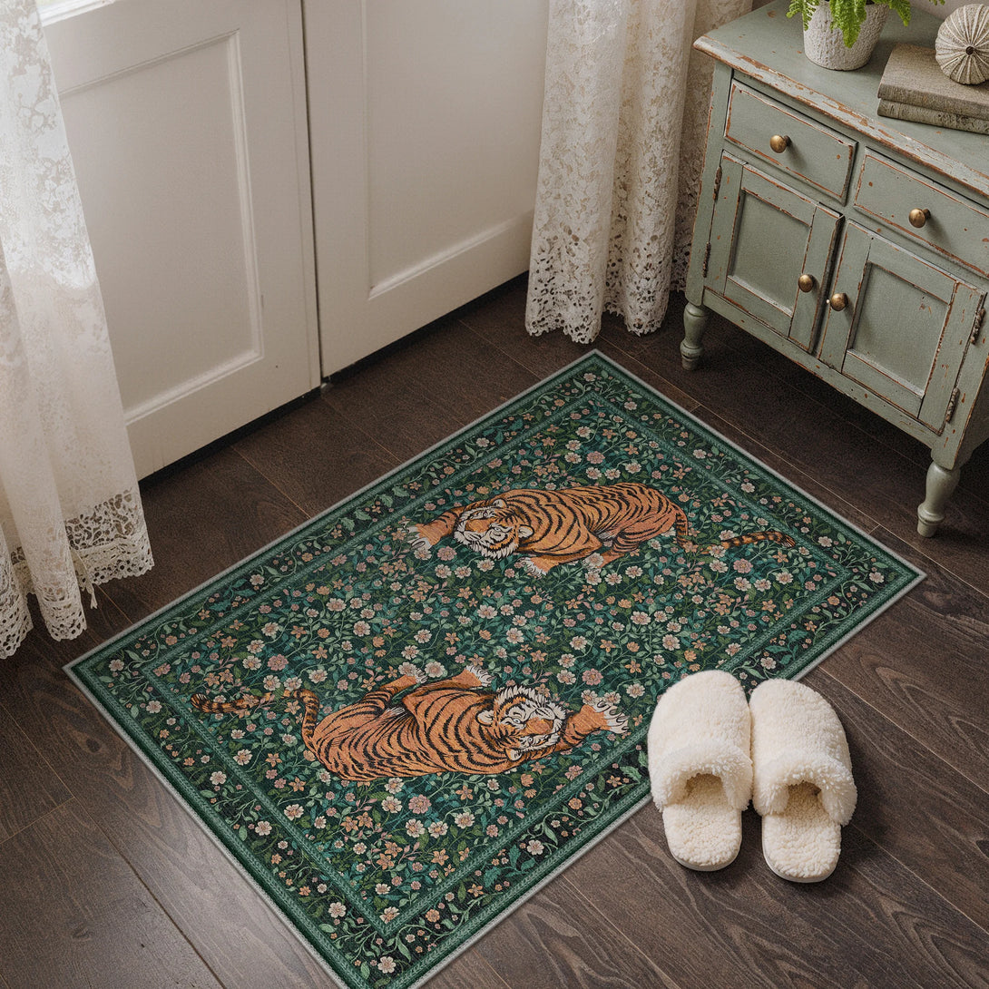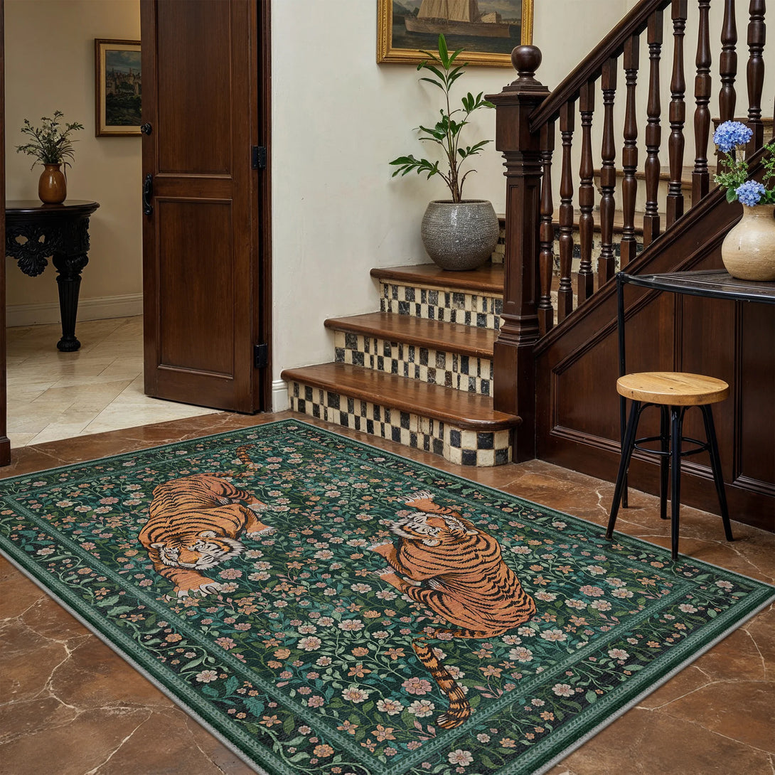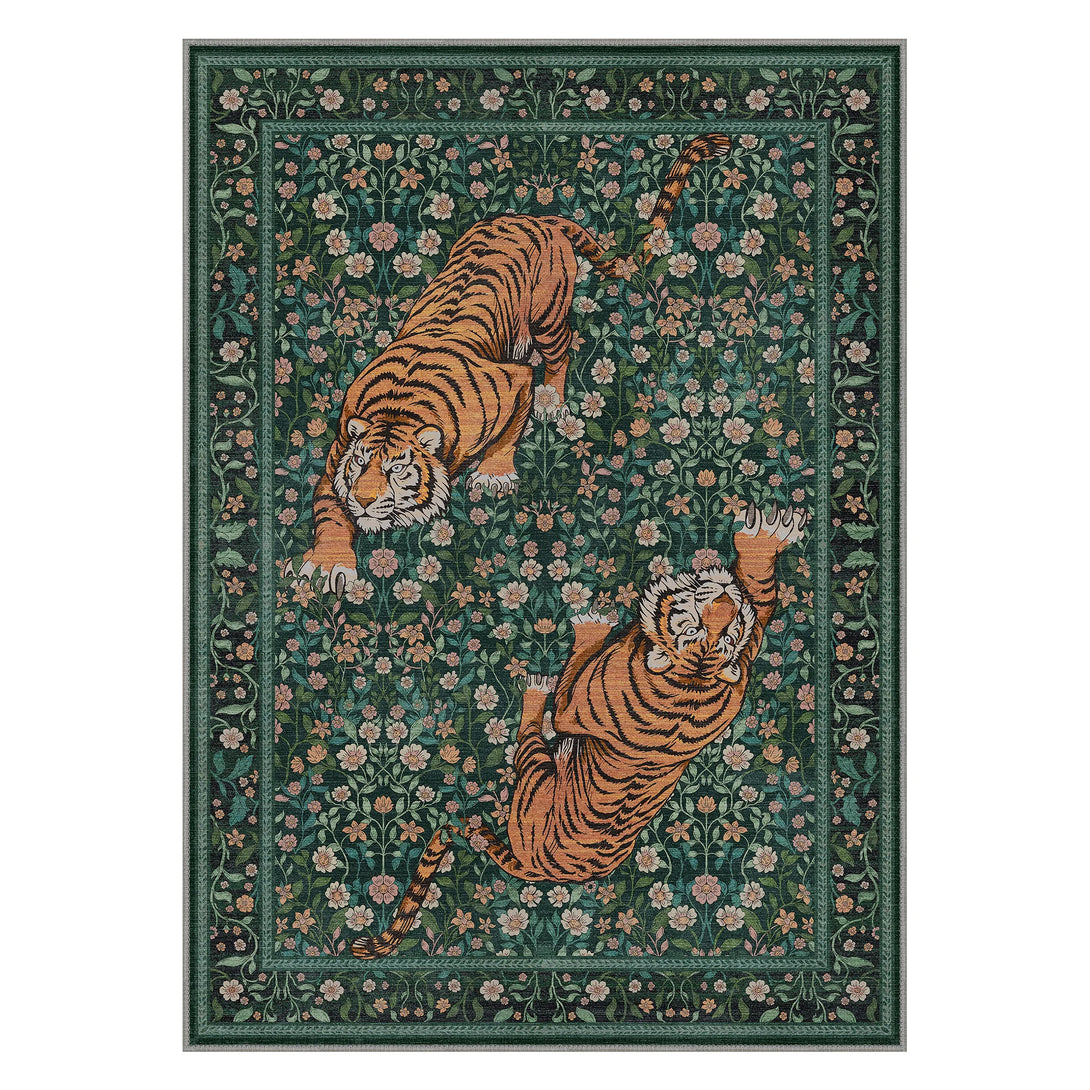 Bring untamed elegance into your space with this striking wild tiger rug. Featuring a sophisticated green palette and captivating tiger design, it transforms any room into a sanctuary of refined style. The plush, soft-touch surface invites barefoot comfort while maintaining its luxurious feel. Designed for practical living, this rug is fully washable, making it effortless to maintain its pristine appearance. Perfect for those who appreciate bold statement pieces without compromising on everyday functionality.