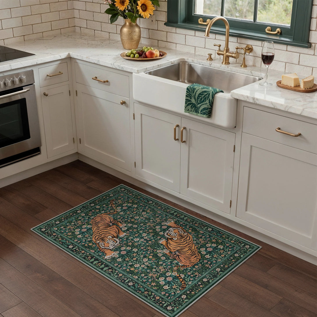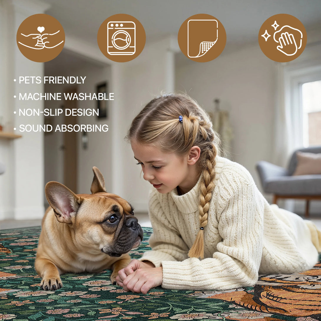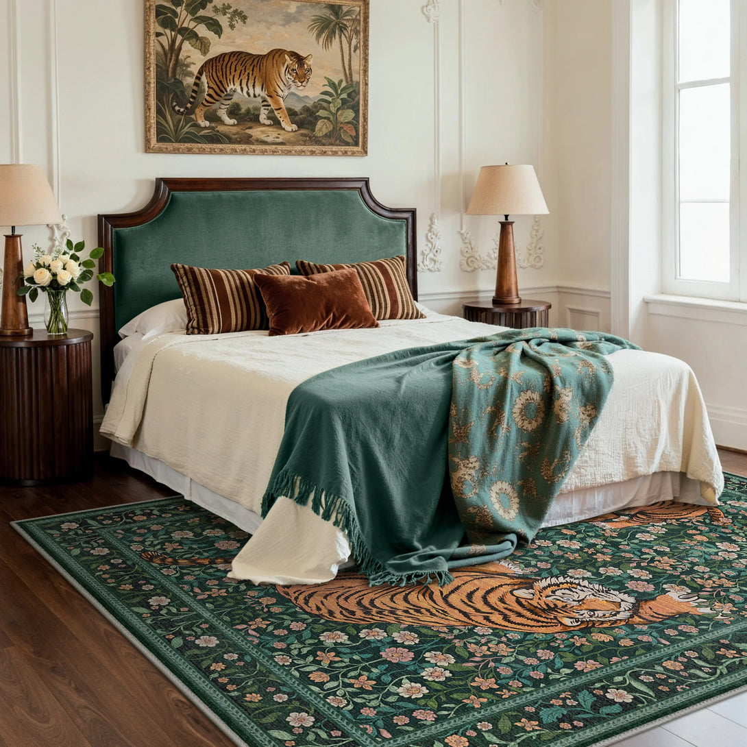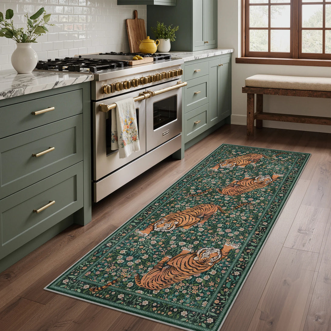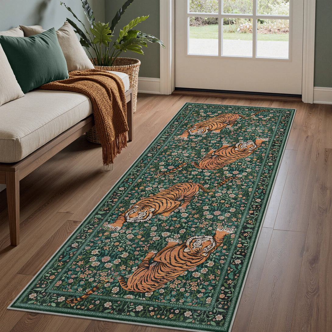 Bring untamed elegance into your space with this striking wild tiger rug. Featuring a sophisticated green palette and captivating tiger design, it transforms any room into a sanctuary of refined style. The plush, soft-touch surface invites barefoot comfort while maintaining its luxurious feel. Designed for practical living, this rug is fully washable, making it effortless to maintain its pristine appearance. Perfect for those who appreciate bold statement pieces without compromising on everyday functionality.