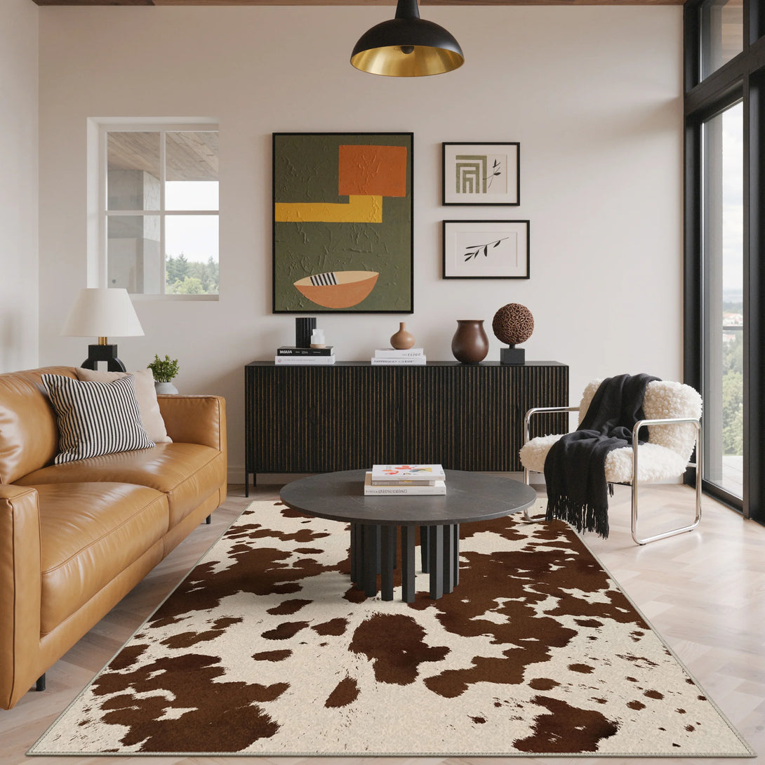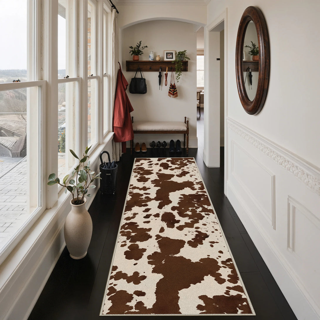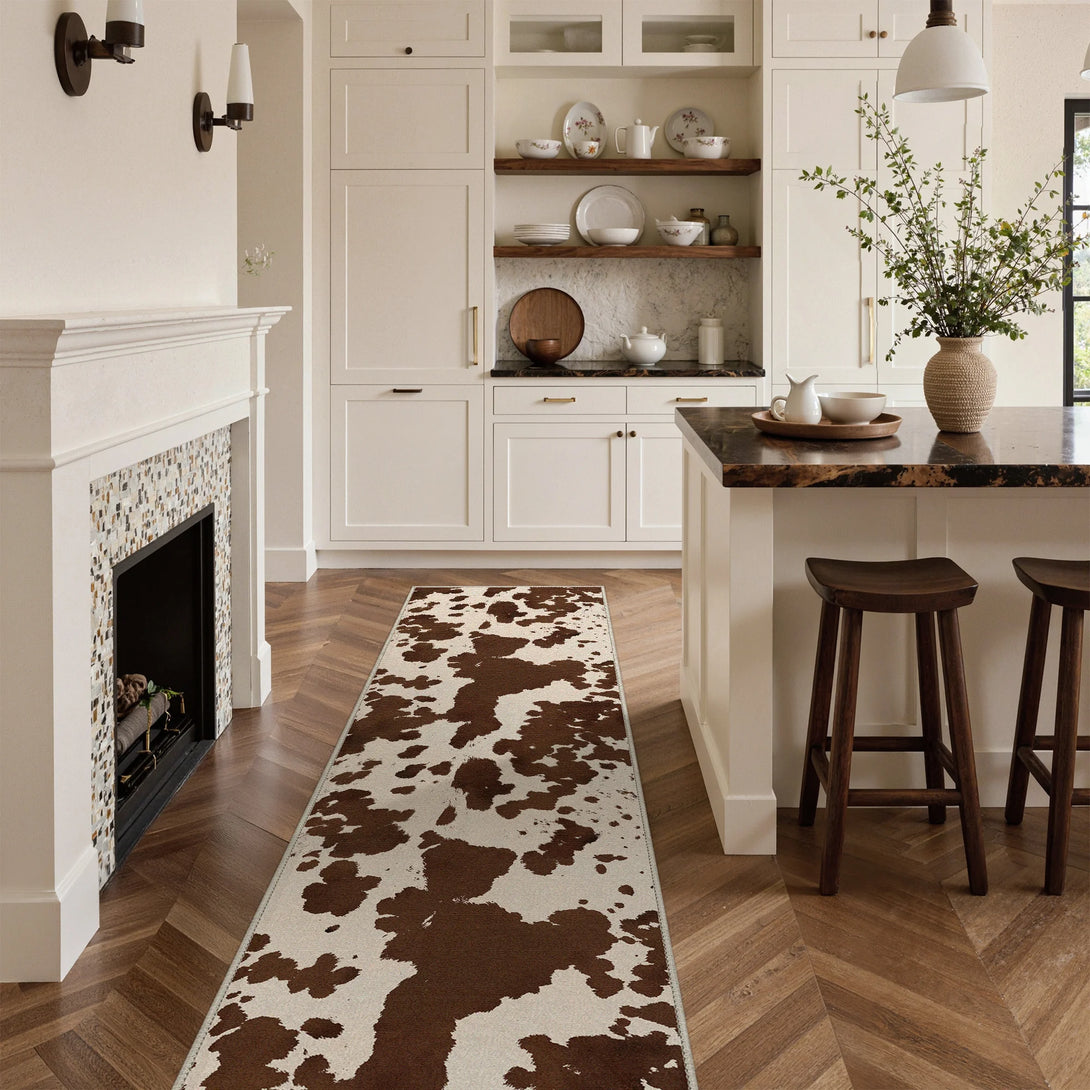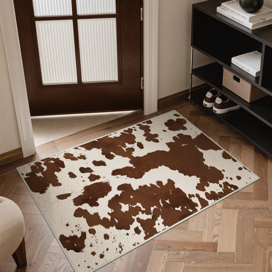 Bring farmhouse charm to any room with this modern cow print rug in rich brown tones. Crafted with a soft touch and non-slip backing, it's designed for comfort and stability on any floor. OEKO-TEX certified for safety and quality, this washable rug makes cleanup effortless—simply toss it in the wash when needed. Perfect for kitchens, bedrooms, or living spaces seeking a cozy, practical addition with distinctive style.