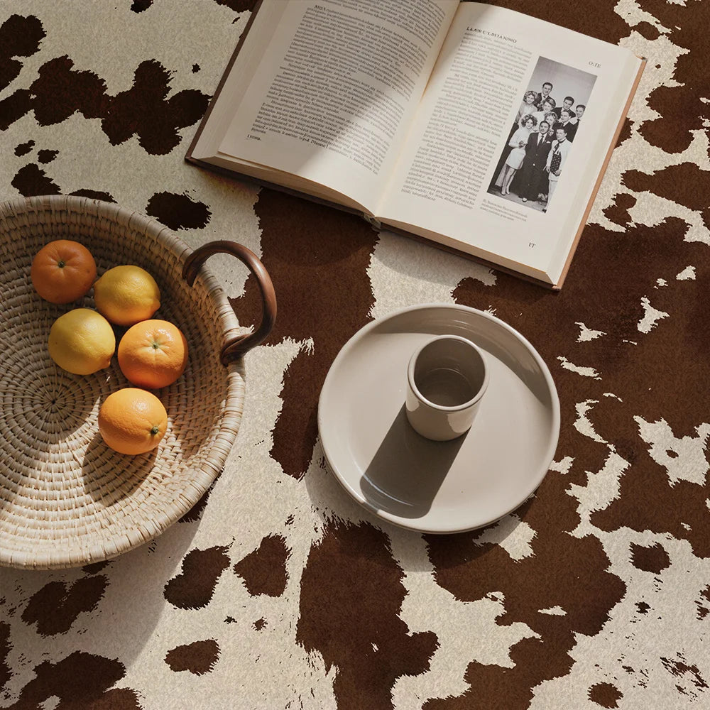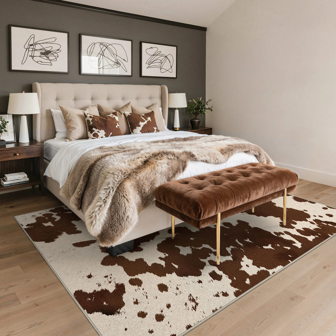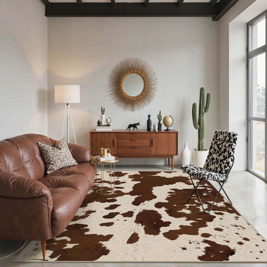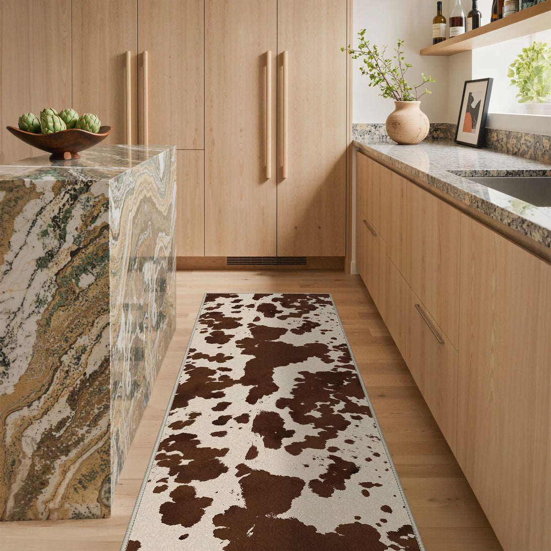 Bring farmhouse charm to any room with this modern cow print rug in rich brown tones. Crafted with a soft touch and non-slip backing, it's designed for comfort and stability on any floor. OEKO-TEX certified for safety and quality, this washable rug makes cleanup effortless—simply toss it in the wash when needed. Perfect for kitchens, bedrooms, or living spaces seeking a cozy, practical addition with distinctive style.