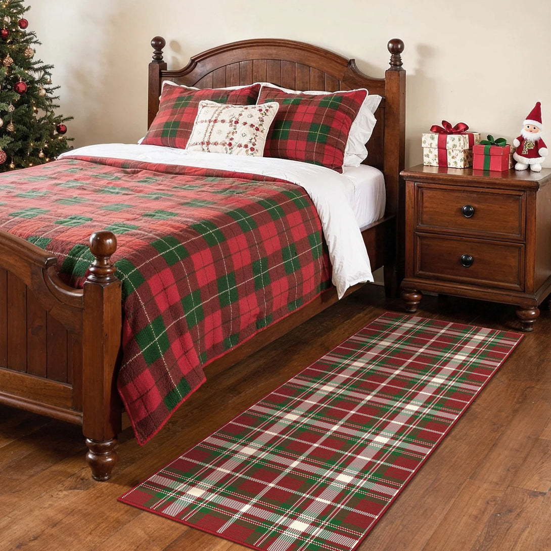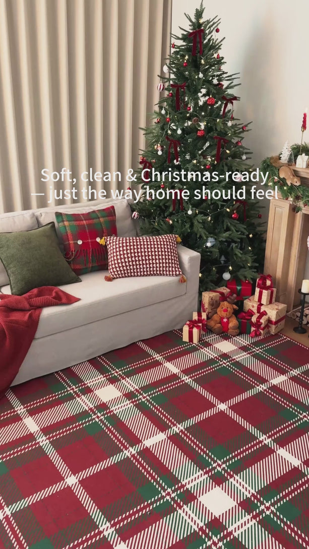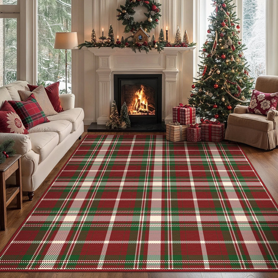 Elevate your holiday decor with the GENIMO Valence Christmas Rug, featuring a classic plaid checkerboard pattern in timeless green and red. Crafted from premium Belgian velvet, this washable rug combines luxurious softness with durability, perfect for festive celebrations and cozy gatherings. The Rug is non slip, cushioned, pet friendly, and easy to clean, making it an ideal accent for holiday festivities and winter charm.
