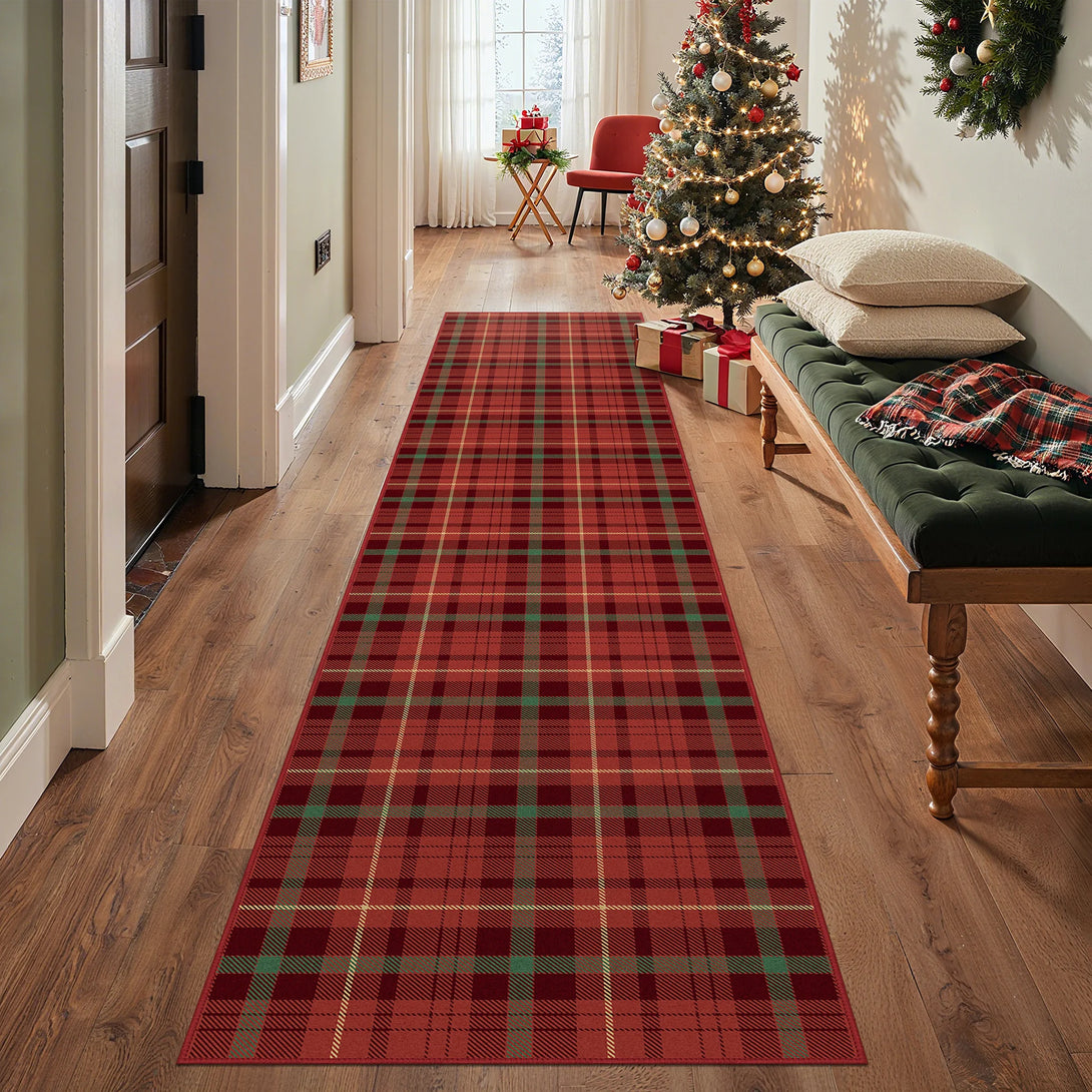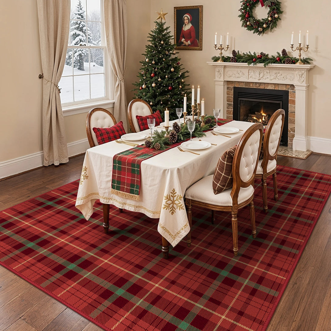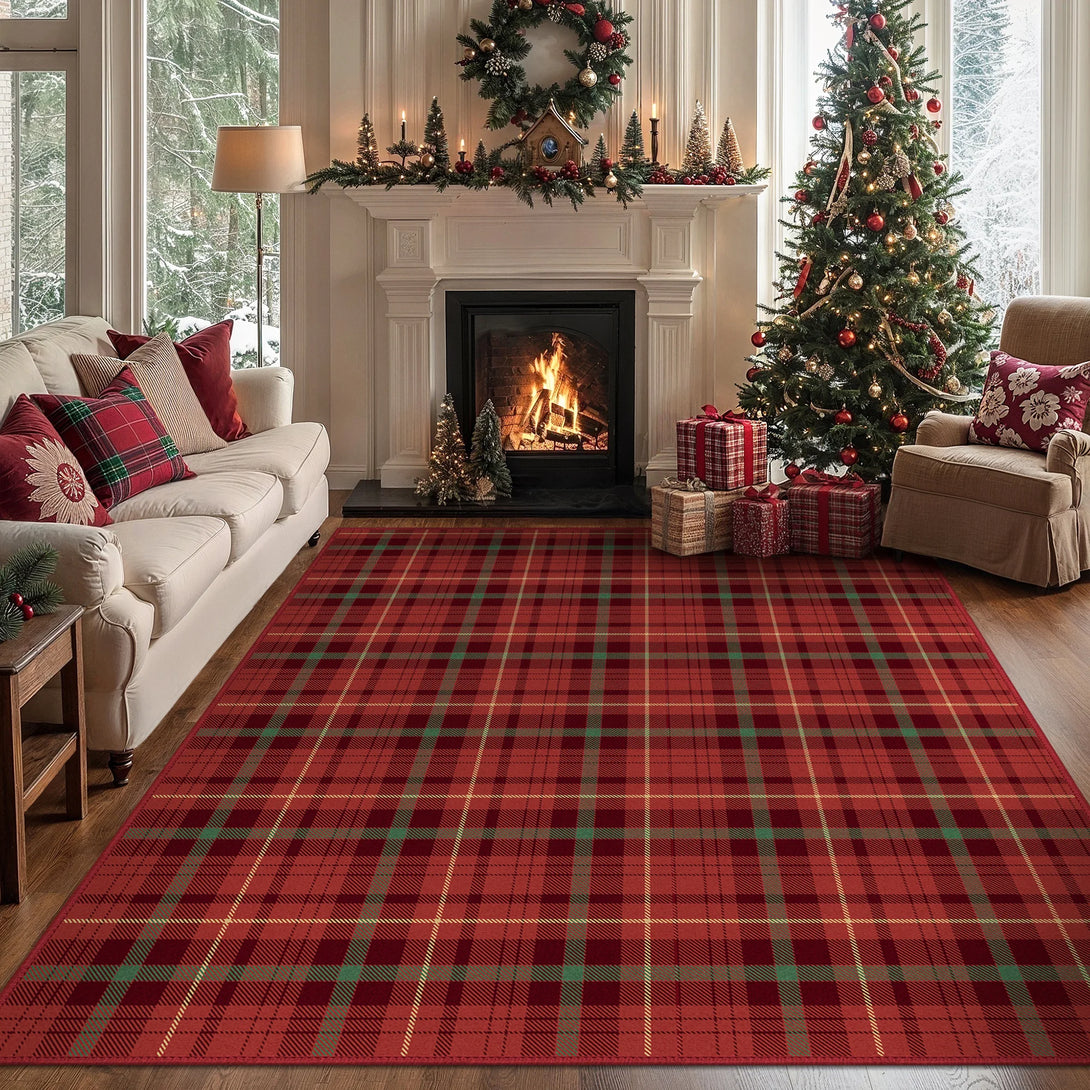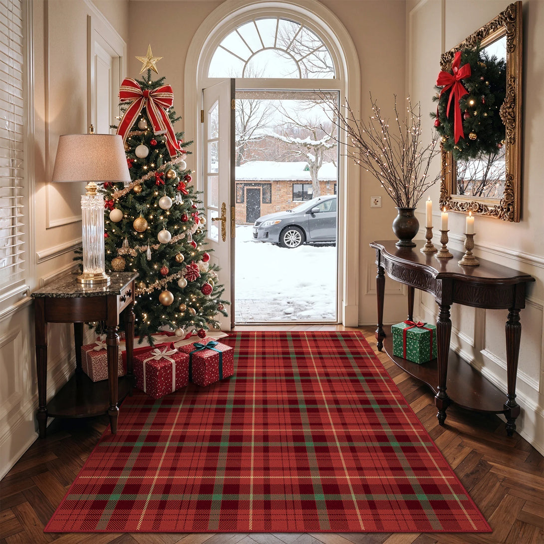 Elevate your holiday decor with the GENIMO Valence Christmas Rug, featuring a classic plaid checkerboard pattern in timeless green and red. Crafted from premium Belgian velvet, this washable rug combines luxurious softness with durability, perfect for festive celebrations and cozy gatherings. The Rug is non slip, cushioned, pet friendly, and easy to clean, making it an ideal accent for holiday festivities and winter charm.