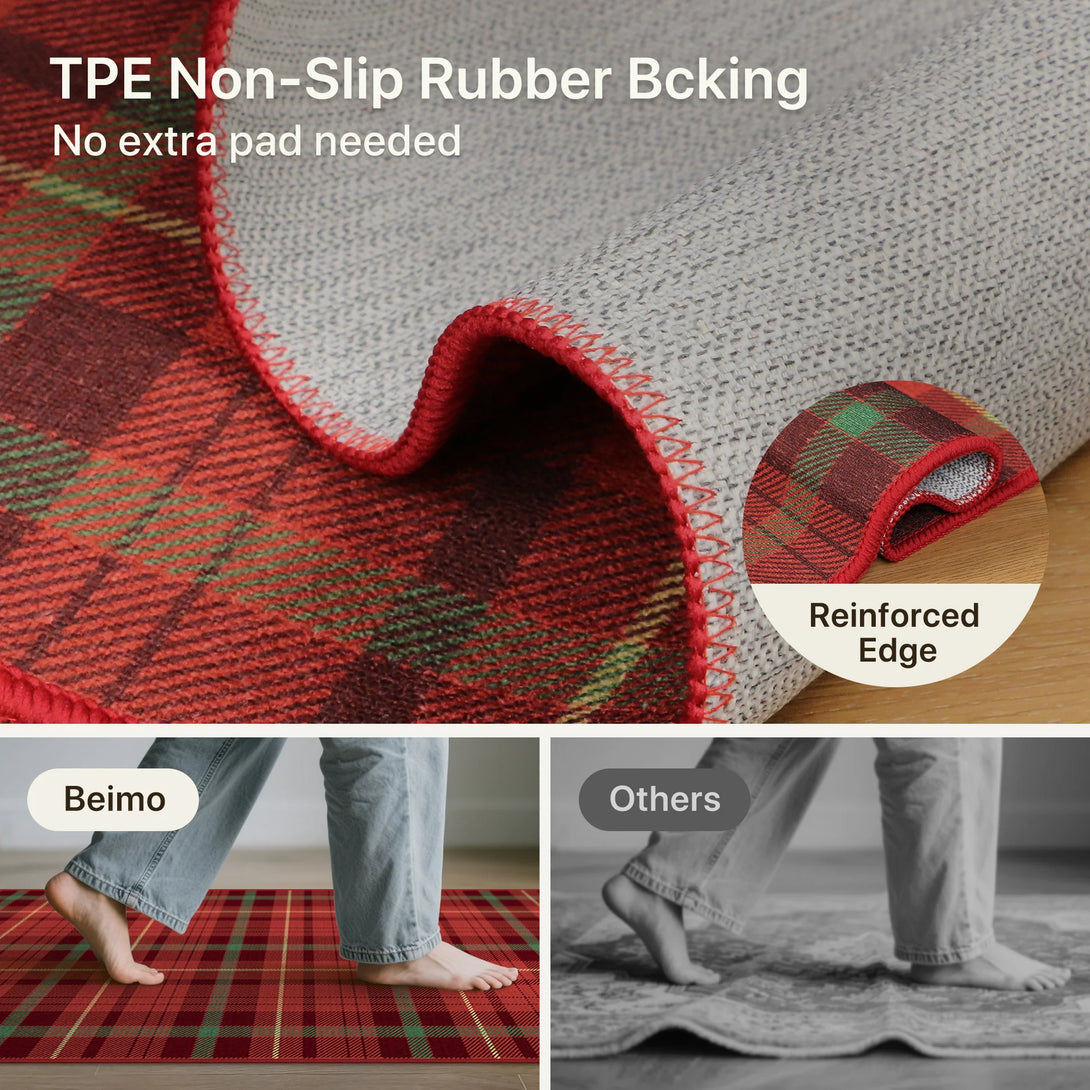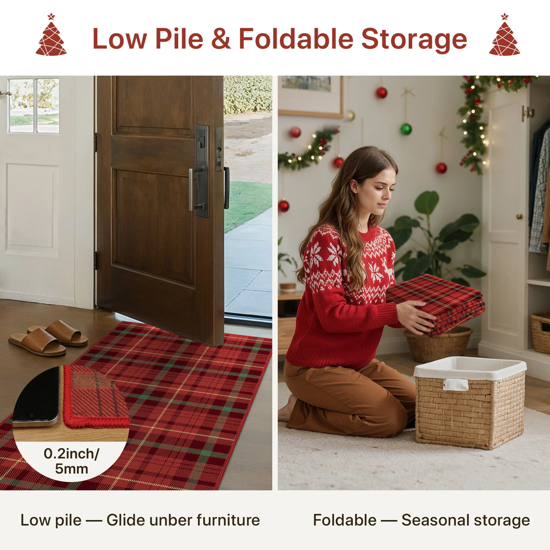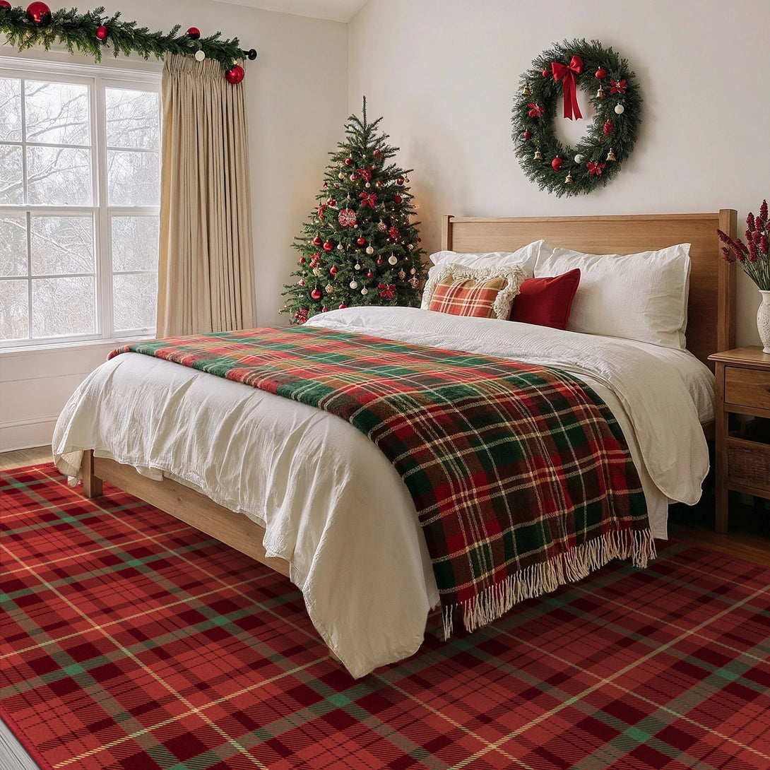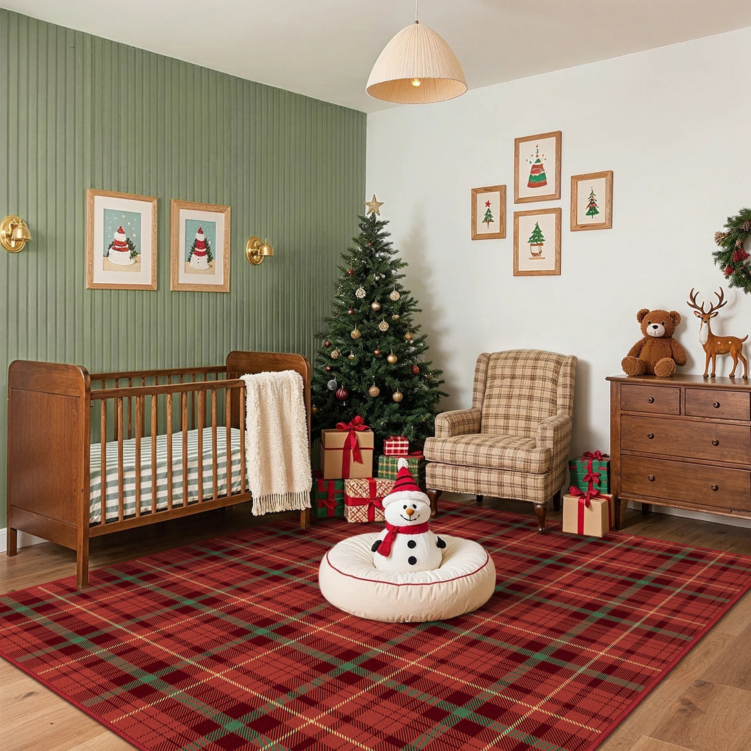 Elevate your holiday decor with the GENIMO Valence Christmas Rug, featuring a classic plaid checkerboard pattern in timeless green and red. Crafted from premium Belgian velvet, this washable rug combines luxurious softness with durability, perfect for festive celebrations and cozy gatherings. The Rug is non slip, cushioned, pet friendly, and easy to clean, making it an ideal accent for holiday festivities and winter charm.