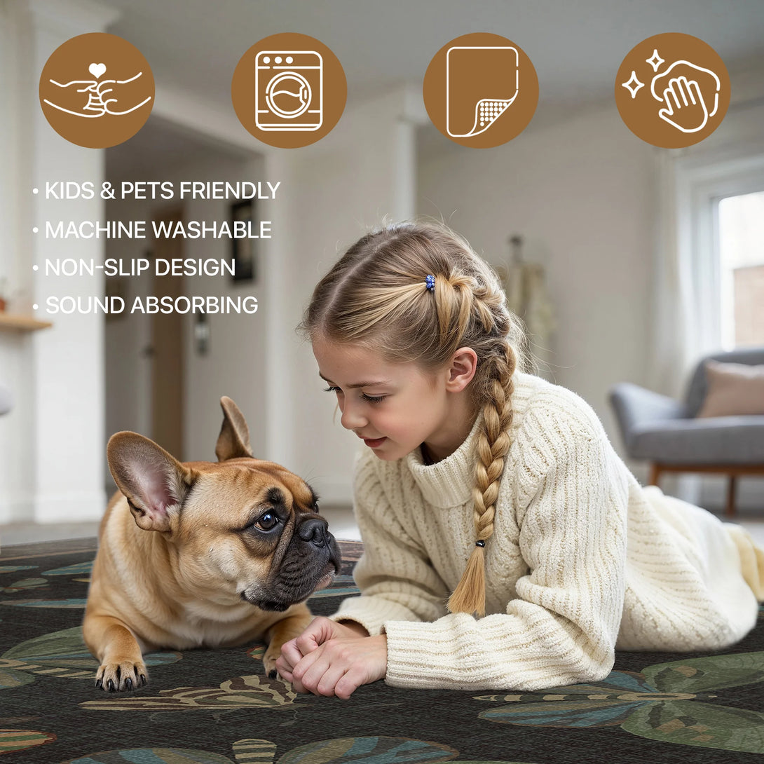 Built-in non-slip backing keeps the rug stable and safe, whether kids are running or pets are playing, even when chairs slide across it.